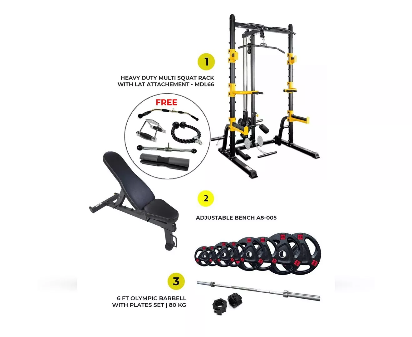 BH فيتنس عرض كومبو ماكينة السكوات + عصا 7 أقدام ومجموعة صحون 80 كيلوجرام مع مقعد قابل للتعديل