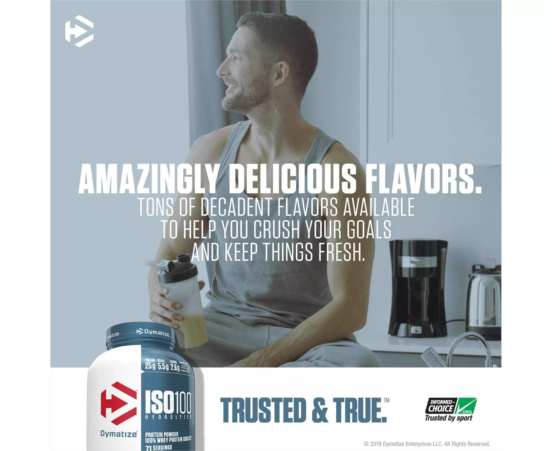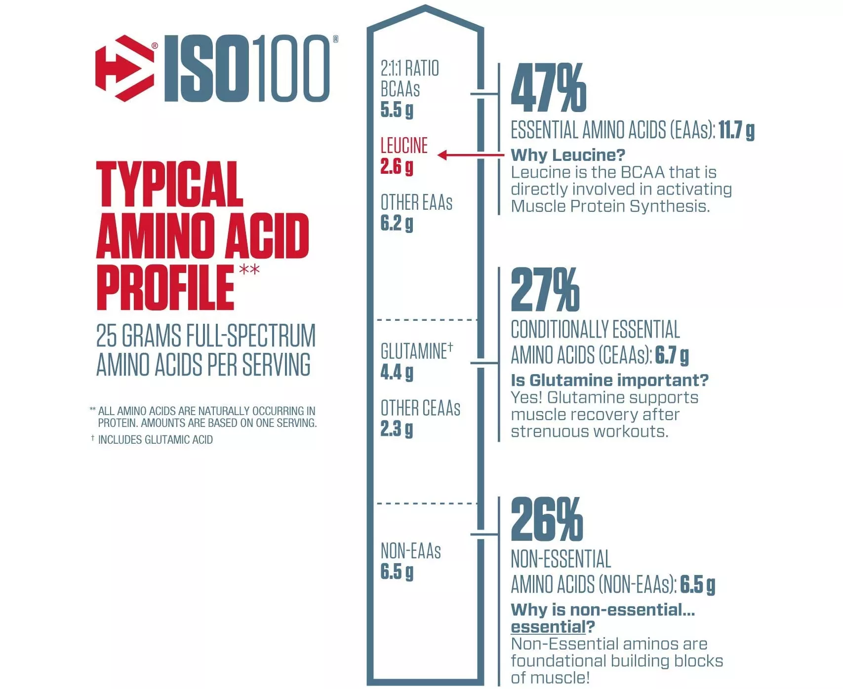 ISO100 is simply muscle-building fuel. Each serving contains 25 grams of protein and 5.5g of BCAAs including 2.7g of L-Leucine. Known worldwide for quality, taste and purity, ISO100 is produced to our highest quality standards. ISO100 is formulated using a cross-flow micro filtration, multi-step purification process that preserves important muscle-building protein fractions while removing excess carbohydrates, fat, lactose and cholesterol. ISO100 is made with pre-hydrolyzed protein sources to ensure fast digestion and absorption.