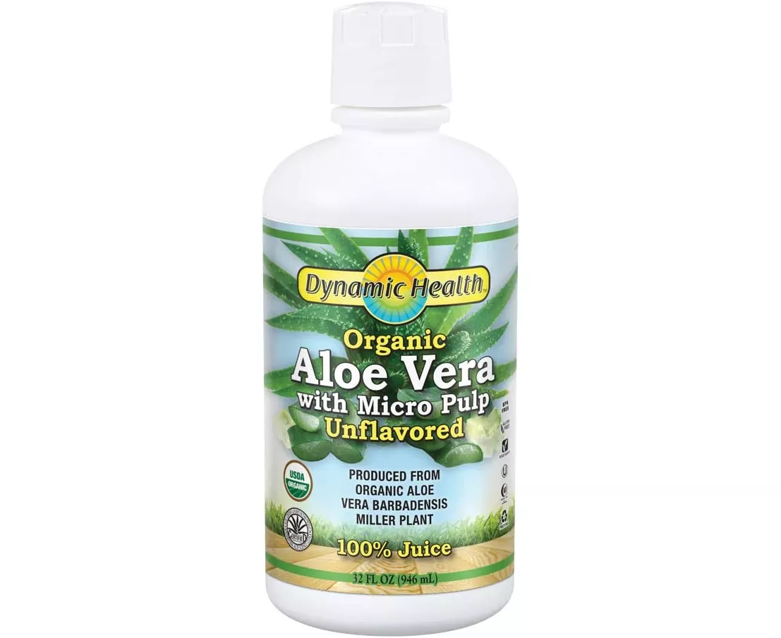 USDA certified organic, vegetarian, BPA free, gluten free, Halal & Kosher, Dynamic Health Organic Aloe Vera 100% Juice contains no added sugar, artificial colors, or sweeteners and mixes well with water, other juices, or served over ice as a refreshing smoothie.