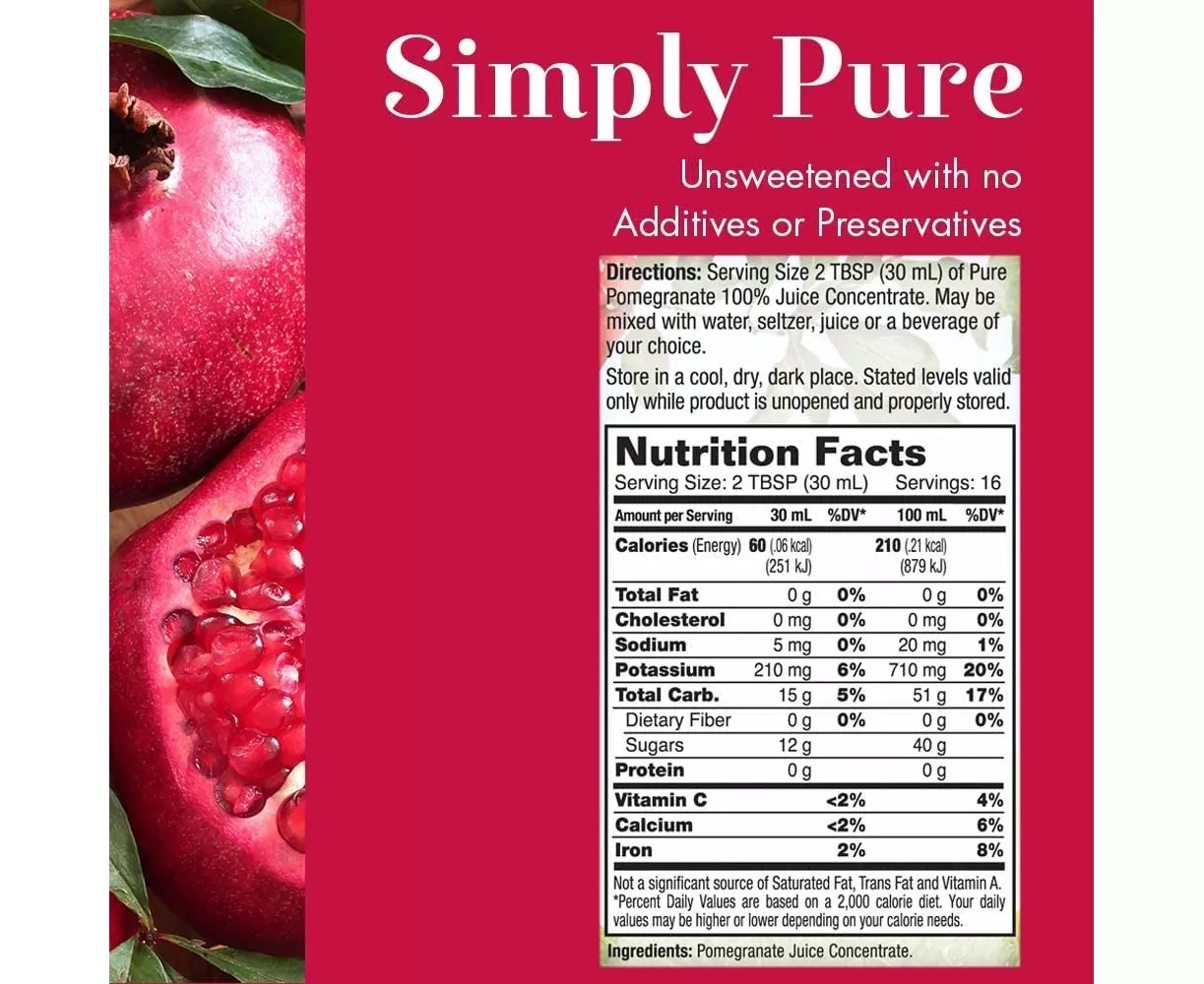Pure Pomegranate Unsweetened Juice Ideal for tropical smoothies, fruit cocktails and as a mixer. A delicious, natural topping for yogurt, ice cream, fruit, pastry and dessert. Contains naturally occurring Punicalagin, Polyphenols, Ellagic Acid and Gallic Acid.