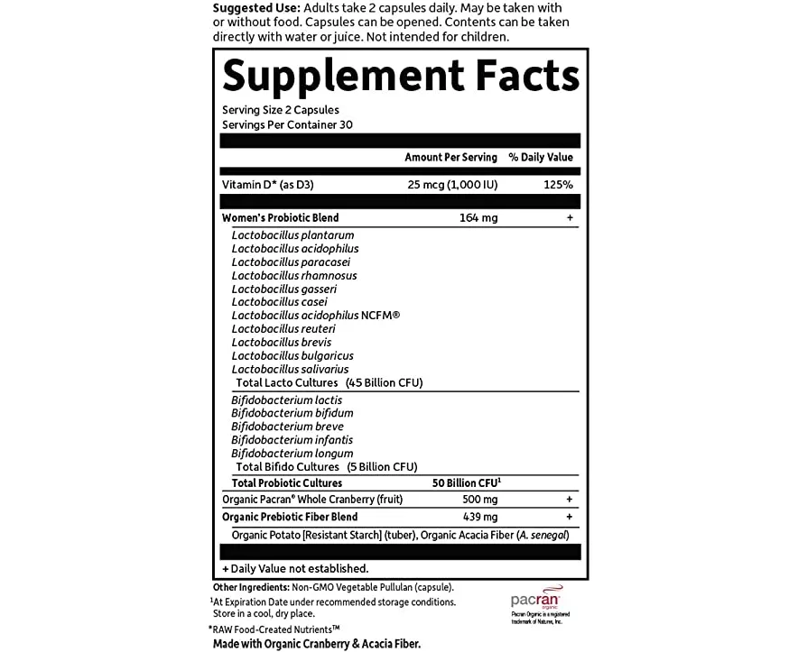 Vitamin D (as D3) from culture of S. cerevisiae; Women’s Probiotic Blend: Lactobacillus plantarum, Lactobacillus acidophilus, Lactobacillus paracasei, Lactobacillus rhamnosus, Lactobacillus gasseri, Lactobacillus casei, Lactobacillus acidophilus NCFM®, Lactobacillus reuteri, Lactobacillus brevis, Lactobacillus bulgaricus, Lactobacillus salivarius, Bifidobacterium lactis, Bifidobacterium bifidum, Bifidobacterium breve, Bifidobacterium infantis, Bifidobacterium longum; Organic Pacran® Whole Cranberry (fruit); Organic Prebiotic Fiber Blend: Organic Potato [Resistant Starch] (tuber), Organic Acacia Fiber (A. senegal). Other Ingredients: Non-GMO Vegetable Cellulose (capsule). Made without dairy or soy ingredients, peanut, tree nuts or shellfish. Manufactured in a facility that also processes soy, dairy, peanut, tree nuts and shellfish. No artificial colors or preservatives.