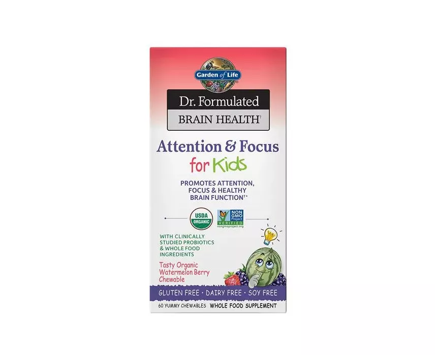 Dr. Formulated Attention & Focus For Kids: Each sweet and tart chewable tablet contains an amazing 10 Billion CFU of Lactobacillus rhamnosus GG one of the most studied probiotic strains, plus brain-supporting nutrients from Whole Food Vitamin D3 and antioxidant-packed Organic Amla berry Vitamin C, Organic wild blueberries and Organic Fenoprolic Pine Bark Extract.