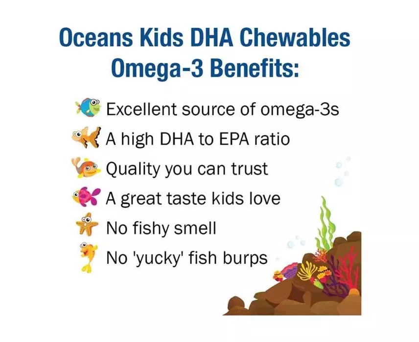 Oceans Kids® DHA Chewables™ Tablets are a fun and convenient way to give your child all the benefits of omega-3s in a delicious raspberry and lemon flavored chewable softgel.