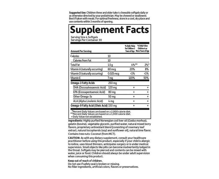 For children three years of age and older, take 4 chewable softgels daily, or as directed by your pediatrician. It can be chewed or swallowed. It is preferable to take it with meals. To maintain optimum shelf life, store in a cool, dry place, use within 3 months of opening.