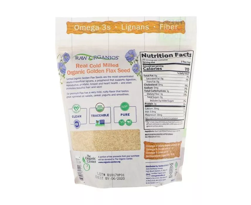RAW Organics is a line of Certified USDA Organic, RAW foods reflecting Garden of Lifes commitment to re-nourish our country with wholesome, Certified Organic, NON-GMO whole foods brought to you at affordable prices, and to re-invigorate the backbone of our culture family farmers providing them with guaranteed contracts and fair wages. Our premium RAW Certified Organic Golden Flaxseed is grown for us in North Dakota on pristine soils. Our family farmers have been growing flax for generations. Our flax goes through a unique five-step cleaning process that gently filters all impurities, leaving behind only the purest, freshest, certified organic golden flax seeds. To unlock their goodness, you need to mill the flax seeds and thats where we really shine, using state-of-the-art cold-milling methods that preserve all of the nutritional value, without releasing the valuable oils which can cause the seeds to go rancid. Certified organic golden flaxseeds are nutritional wonders and are THE most concentrated sources of beneficial lignans. Our premium flax has a mild, nutty flavor that tastes great sprinkled on salads, cereal, yogurts and smoothies. Each serving of RAW Organics Real Cold Milled Organic Golden Flaxseed delivers a total of 5g of healthy omegas 3g of omega-3s (alpha-linolenic acid, or ALA), 1g of omega-6s (linoleic acid, or LA) and 1g omega-9s (oleic acid, or OA) as well as 98mg of antioxidant lignans (SDG).