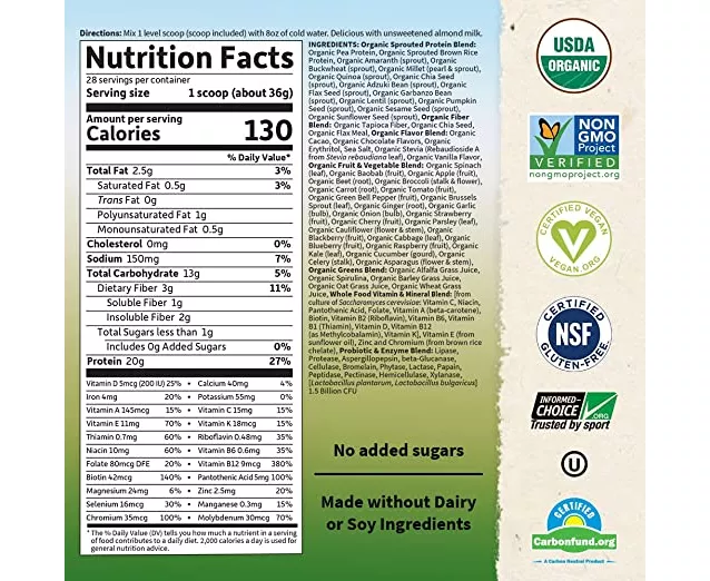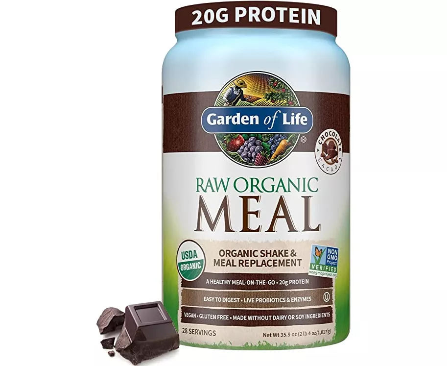 Raw Organic Meal is a delicious organic MEAL-ON-THE-GO packed with incredible nutrition to help you satisfy hunger, manage weight and feel great!* Raw Organic Meal replacement powder uniquely combines the goodness of Organic plant based superfoods—complete protein from peas, sprouted grains, seeds and legumes, juiced greens, and fruits and veggies—with live probiotics and enzymes, and whole food vitamins and minerals, bringing you one complete raw Organic meal replacement. This plant based protein powder is Third-Party tested and Certified USDA Organic, Non-GMO, Gluten Free, Vegan, Kosher and Certified for Sport by Informed Choice. Chocolate Raw Organic Meal Replacement Shakes are made without added sugars or artificial ingredients. It's RAW—produced at low temperatures (below 115 degrees F) to preserve amino acid integrity—and undenatured, since heat and processing can denature proteins. Designed to be part of an overall healthy lifestyle, Raw Organic Meal—combined with exercise—may enhance your personal diet and exercise plan.* Consult your healthcare professional before undertaking any changes in your daily diet and exercise regimen to determine what is best for your individual needs. *These statements have not been evaluated by the Food and Drug Administration. This product is not intended to diagnose, treat, cure or prevent any disease.