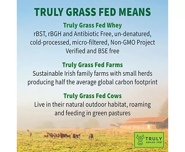 Although many whey protein products may call themselves “grass fed,” our research showed this wasn’t truly the case. Almost all dairy farms still used animal feed full of soy, corn and GMOs. Why? Typically, there are too many cows to feed year-round on grass. Our search ultimately ended in Ireland with a coop of 4,800 generational family farmers whose herds feed only in green pastures.
