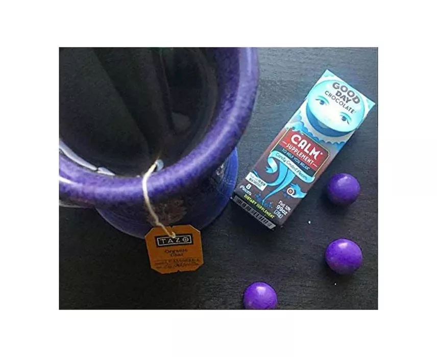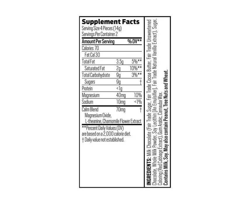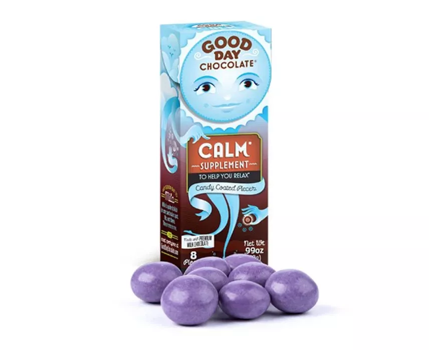 The Good Day Chocolate Calm Supplement combines L-theanine, a naturally occurring amino acid found in soothing tea, with relaxing chamomile flower, and Fair Trade milk chocolate for a treat that releases tension and anxiety.