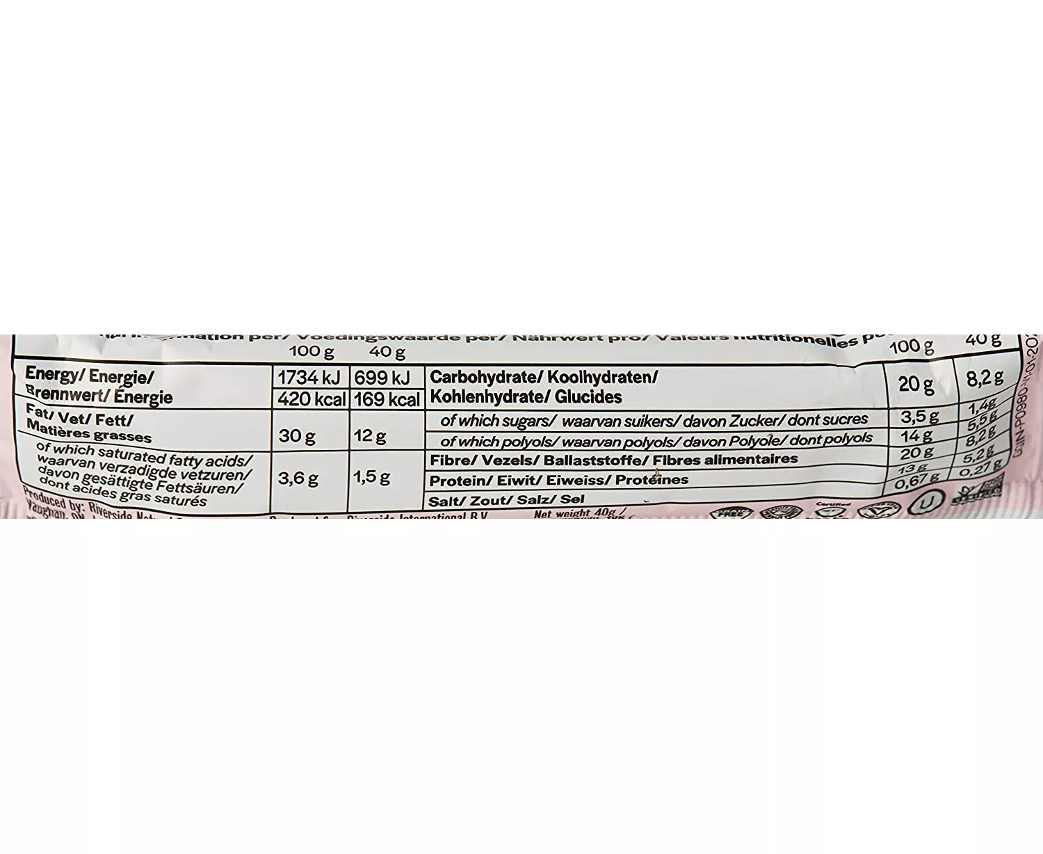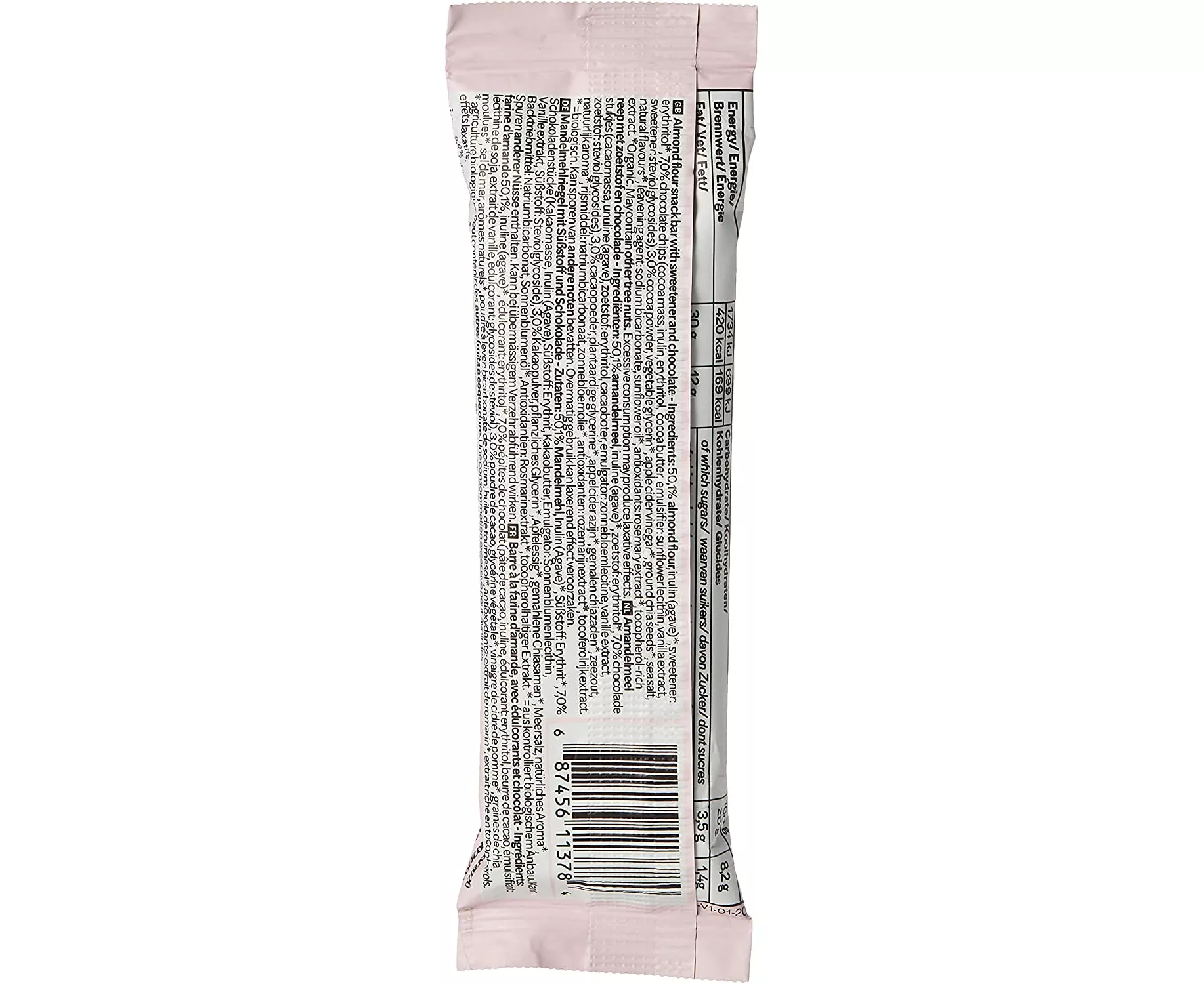 Almond flour, Organic Inulin, Organic Erythritol, Chocolatey chips (Unsweetened chocolate), Inulin, Erythritol, Cocoa Butter, Sunflower lecithin, Vanilla extract, Stevia leaf Reb M), Cocoa powder, Vegetable Glycerin, Organic Apple cider vinegar, Organic Ground chia seeds, Sea salt, Baking soda, Organic Rosemary Extract, Mixed tocopherols (To preserve freshness), Natural Flavor.