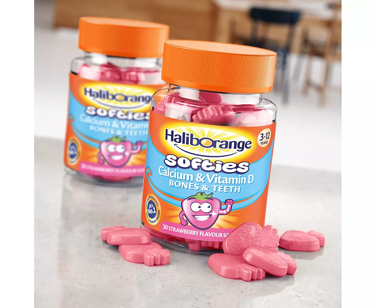 30 strawberry flavour calcium & vitamin d softies-food supplements. 100% nrv of sunshine vitamin d: essential for the normal growth and development of bones in children