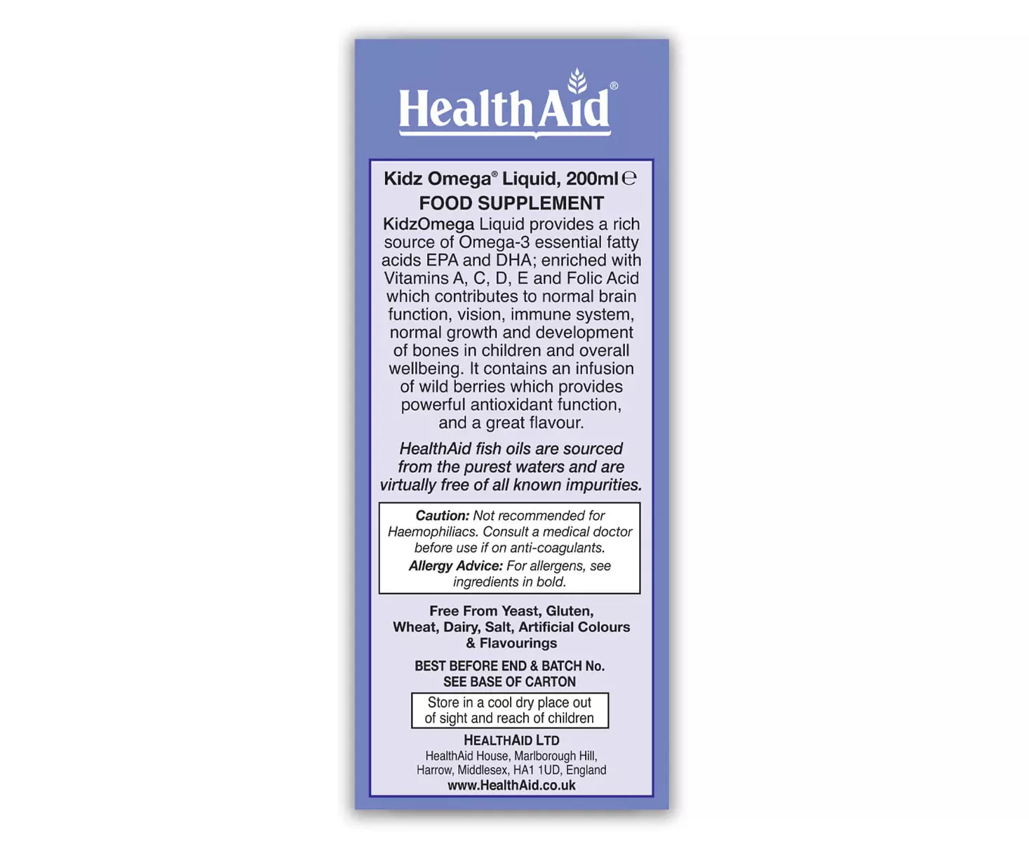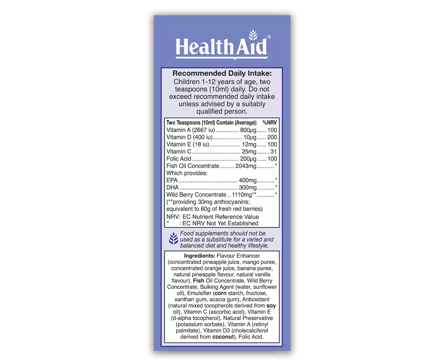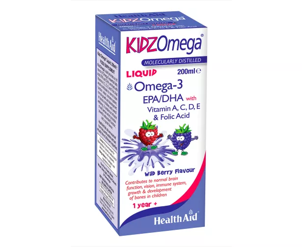 KidzOmega Liquid provides a rich source of omega-3 essential fatty acids EPA and DHA; enriched with Vitamins A, D, E, C and Folic Acid. It contains an infusion of wild berries which provide powerful antioxidant function, and a great flavour. KidzOmega Liquid contributes to the maintenance of optimum growth, brain development and overall wellbeing.
