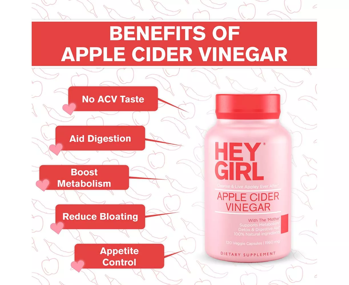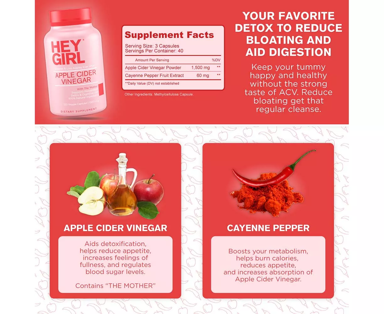 Hey, girl apple cider vinegar capsules contain apple cider vinegar and cayenne pepper that improves metabolism and digestion.