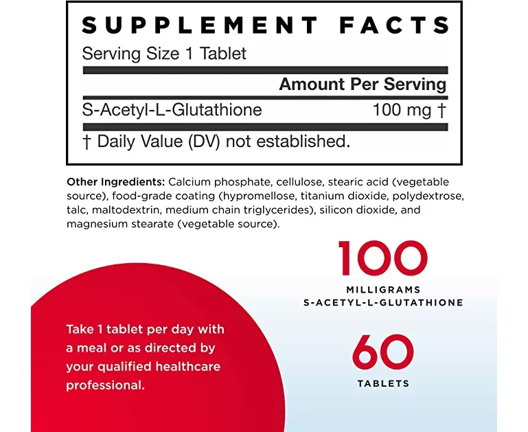 S-acetyl l-glutathione 100 mg, calcium phosphate, cellulose, stearic acid (vegetable source), silicon dioxide, magnesium stearate (vegetable source), and a food-grade coating.
