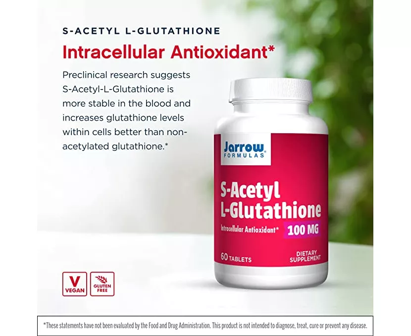 Jarrow Formulas S-acetyl-l-glutathione increases glutathione levels within cells better than non-acetylated glutathione. It is more stable in the blood and increases glutathione levels within cells better than non-acetylated glutathione.