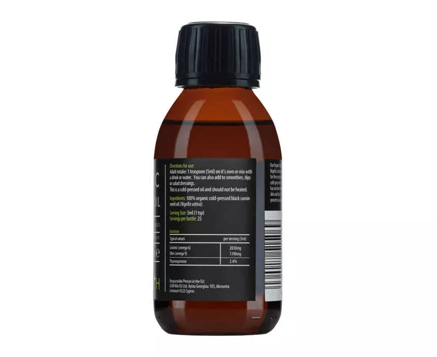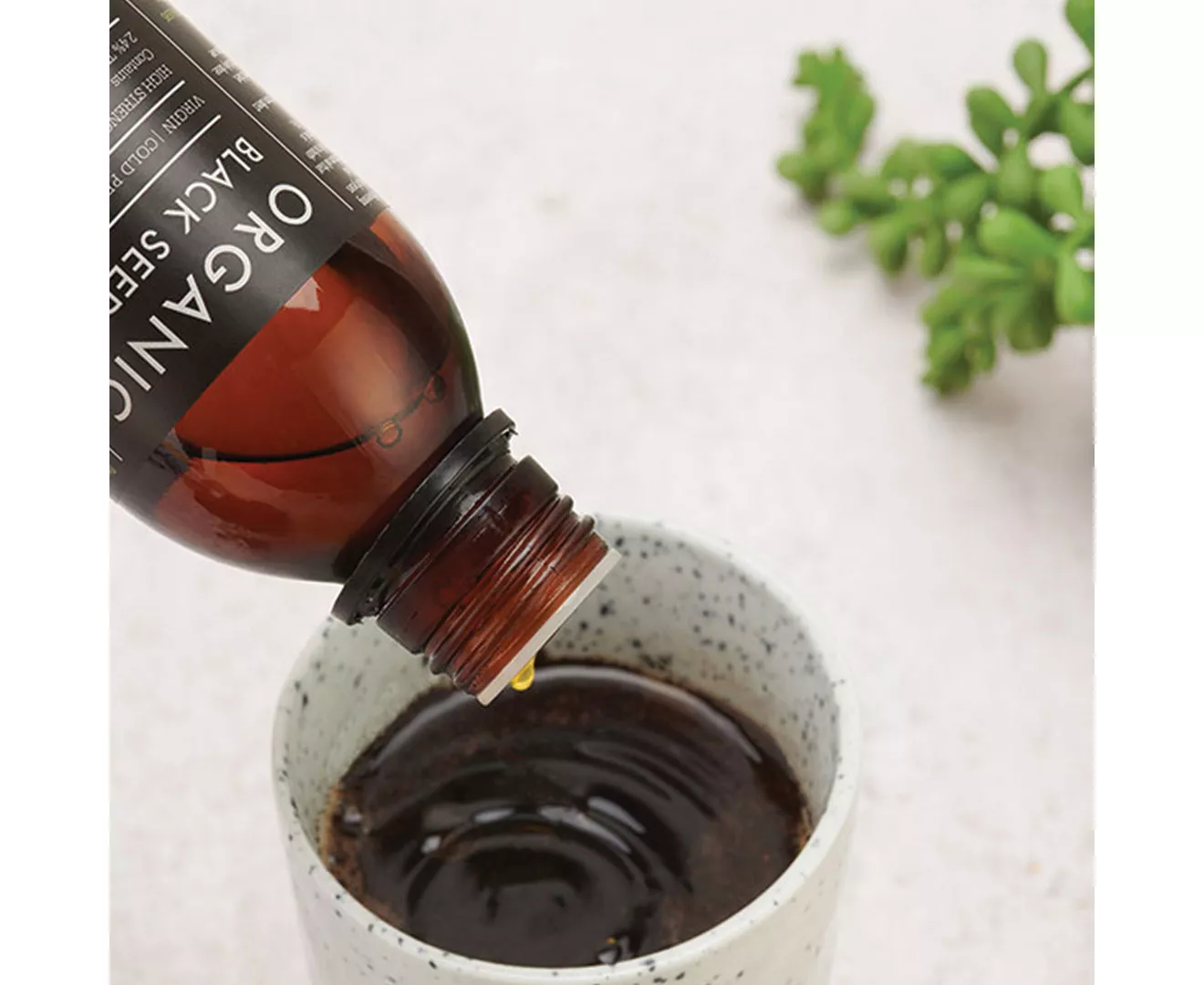 100% organic cold-pressed black cumin seed oil (Nigella sativa).