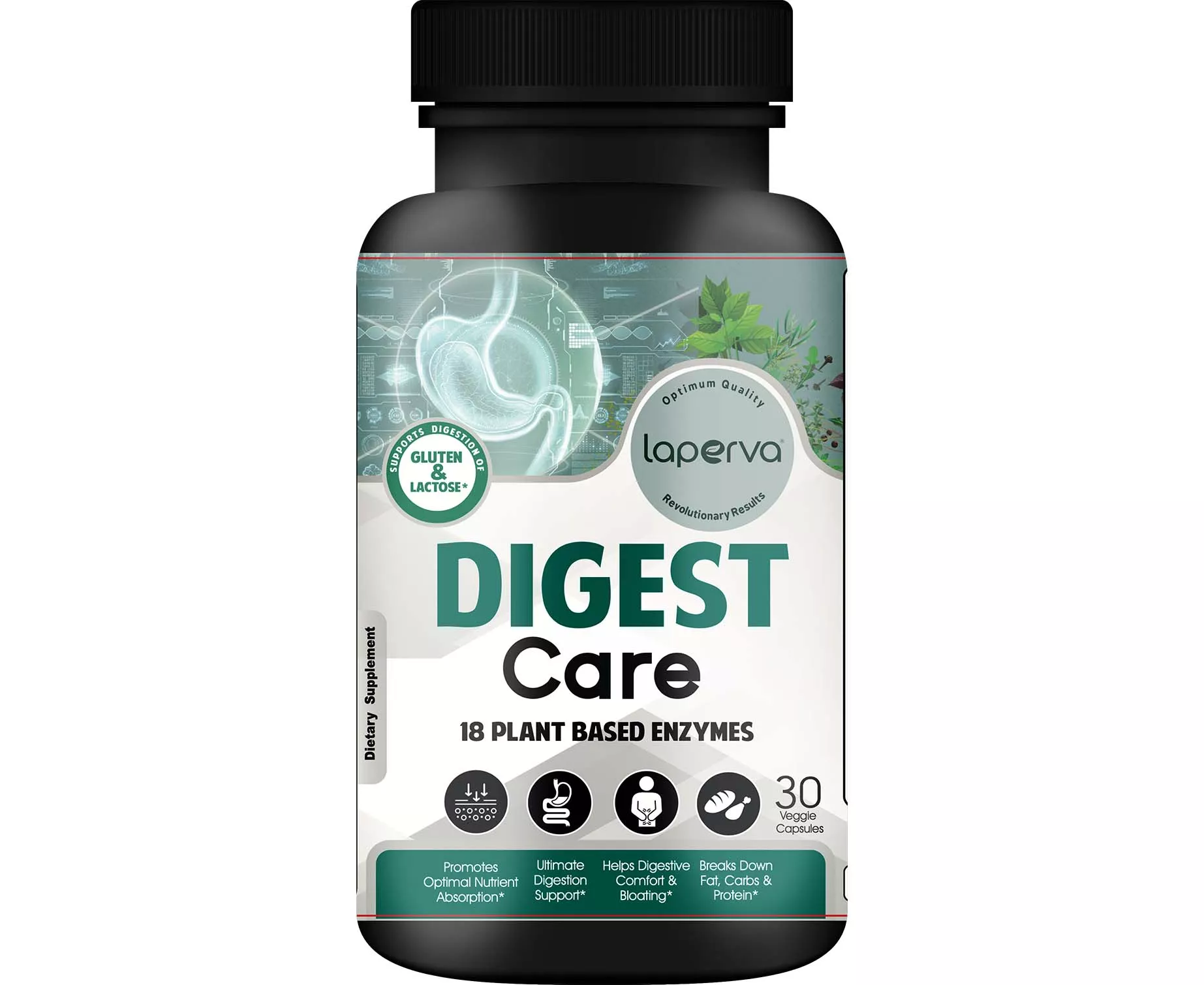Laperva Digest Care is a comprehensive blend of enzymes that help to support proper digestion. This product's combination of enzymes assists in the breakdown of fat, fiber, protein, and carbohydrate, thus optimizing the availability of nutrients in the food you eat. They play a critical role in digestion and nutrient assimilation, and in the immune response. Aspergillopepsin breaks down gluten 60 times faster than any other enzyme, setting out complete digestion. The lactase enzyme breaks down the milk sugar, lactose, into an easily digestible form, it is the optimal support for the digestion of dairy products.