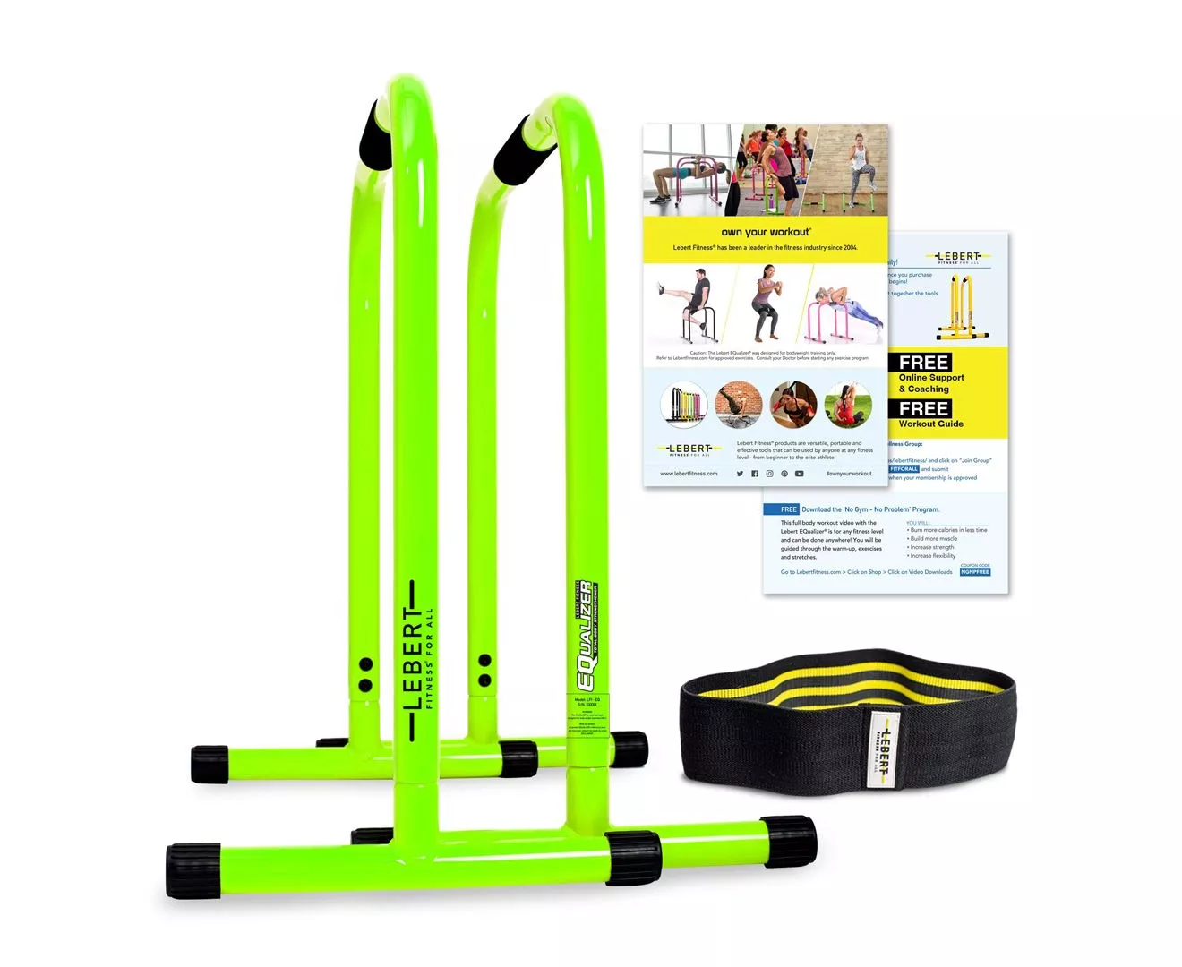 • Two Equalizer bars with heavy duty foam handles, resistance band, exercise guide, and access to an online coaching group. Bars support up to 400lbs, are easy to assemble, stack and store and are great for your home gym or group class bootcamps.
