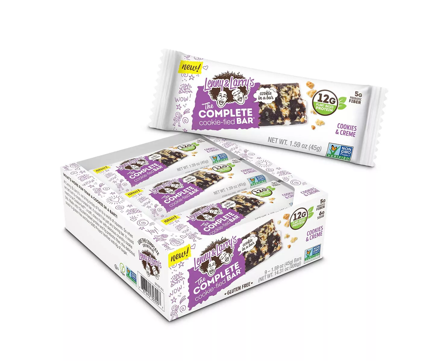 Lenny & Larry's The Complete Cookie-fied Bar™ Has 6g of Sugar and is Gluten-free, Non-GMO Project Verified, Vegan, and Kosher-friendly. The Bars Are Free From Dairy, Egg or Soy Ingredients, High Fructose Corn Syrup, and Artificial Sweeteners.
