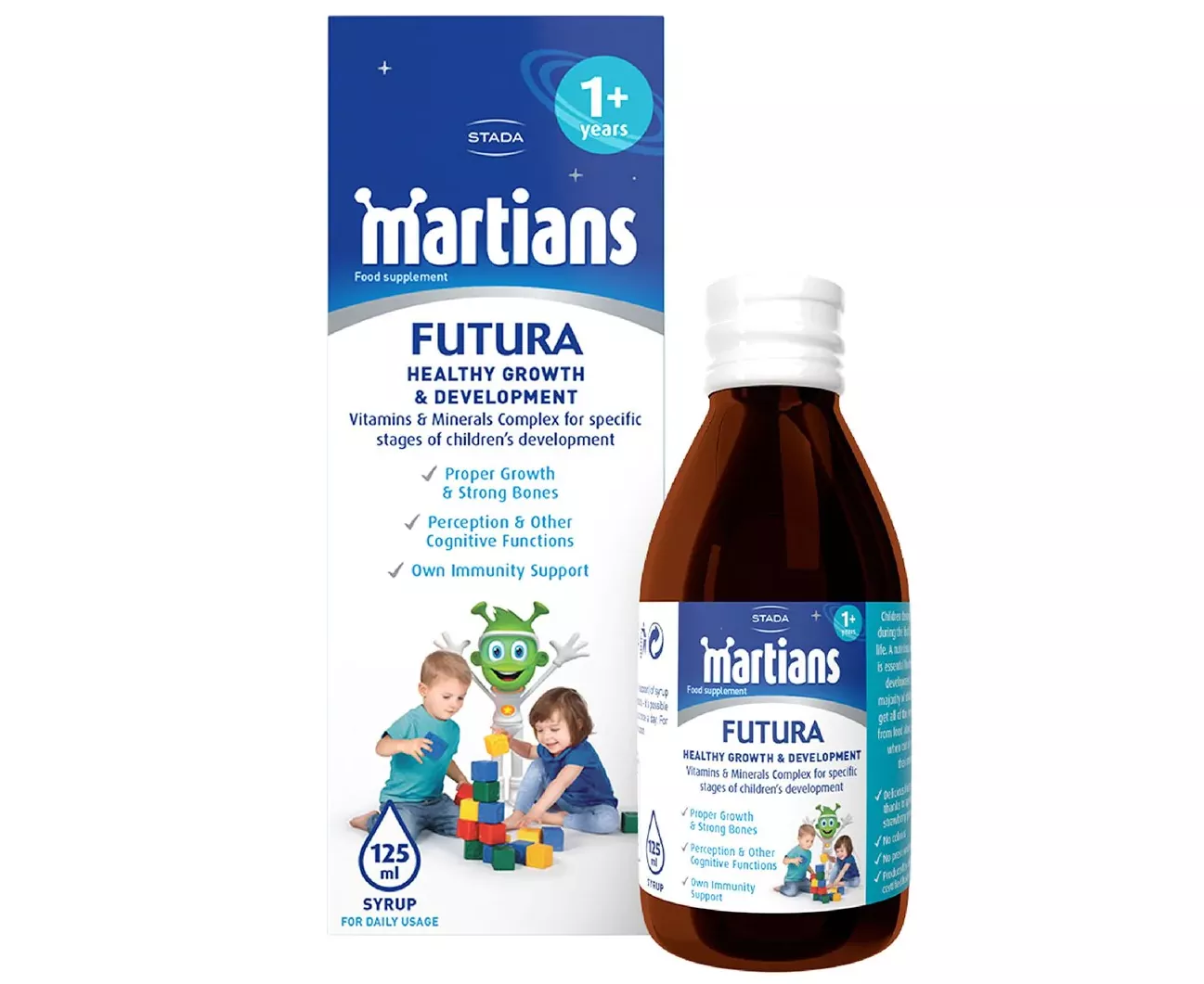 Martians Futura Syrup has been specially created for healthy growth and development of children. Martians Futura Syrup for Healthy Growth & Development contains Calcium and Vitamin D3 for children's bone development, Vitamin K2 for the maintenance of normal bones and Iron to contribute to normal cognitive development such as perception.