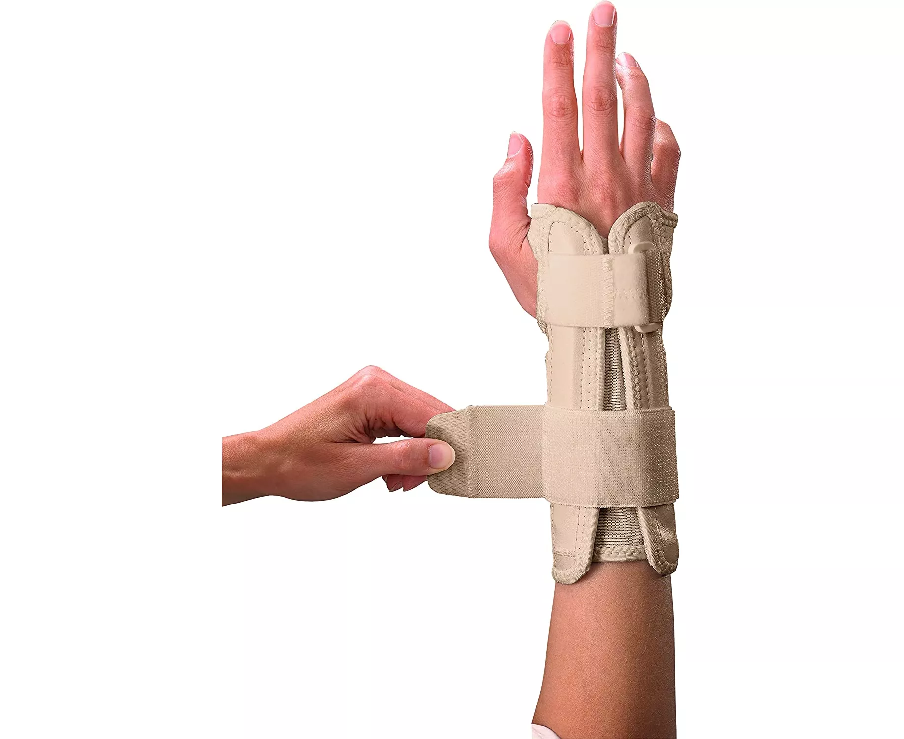 Mueller® Carpal Tunnel Wrist Stabilizer has an extra-long metal spoon to help relieve pain associated with Carpal Tunnel Syndrome. Features an extra-long 6.5” removable metal spoon, two side splints, and padding around the splint for extra comfort. Made with breathable materials.