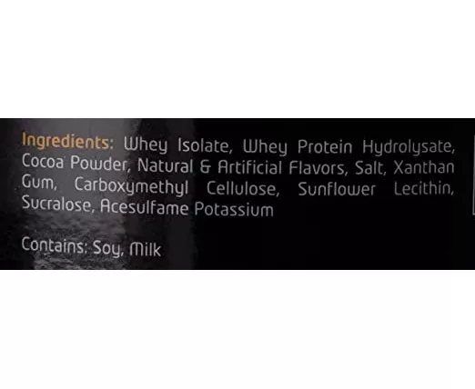 Whey isolate, whey protein Hydrolysate, coca powder, Artificial Flavors, salt, Xanthan Gum, Carboxymethyl cellulose sunflower Lecithin sucralose Acesulfame potassium.