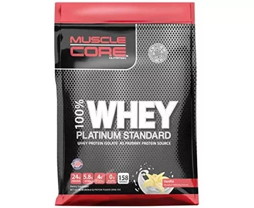 Whey Protein Isolate as the main ingredient (79% Isolate by Weight) Highest Protein Percentage: 24g of Protein - 83% Protein by Weight Less than 2grams of Carbohydrates, Zero Sugars & Zero Fat Over 5.8grams of Branched Chain Amino Acid (BCAA’s) Per Serving With 4g Glutamine and Glutamic Acid and other Bio-active Peptides for Muscle Recovery Fortified with Digestive Enzymes-Lactase and Aminogen to Enhance Protein Utilization. Manufactured in state-of-the-art GMP certified facility in U.S.A Muscle Core 100% Whey Platinum Standard 10 LB Vanilla Flavor.