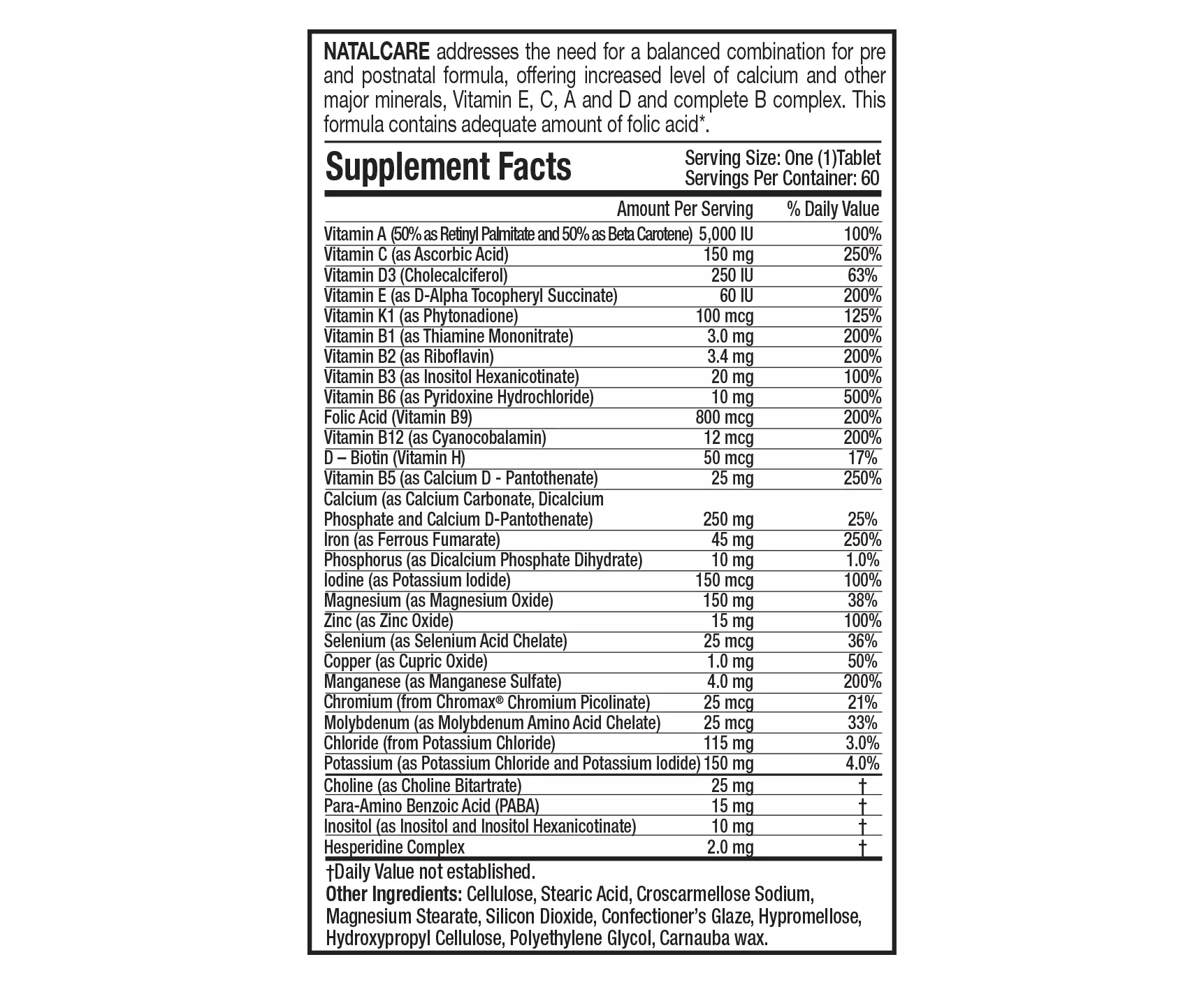 NatalCare contains 28 essential nutrients including Folic Acid, Beta-Carotene, sufficient amounts of Calcium, Magnesium, all B Vitamins, Iron, Zinc, Manganese, Copper, and Selenium for pregnant & lactating women. The important vitamins and minerals included in this supplement offer support for a healthy pregnancy and for the proper development of child. Also included are Copper and Zinc, which are essential to the healthy development of the nervous system and motor functions. Iron is added to meet the increased demands during pregnancy and to minimize any anemic conditions.Iron is specially needed during pregnancy and to minimize any anemic conditions.