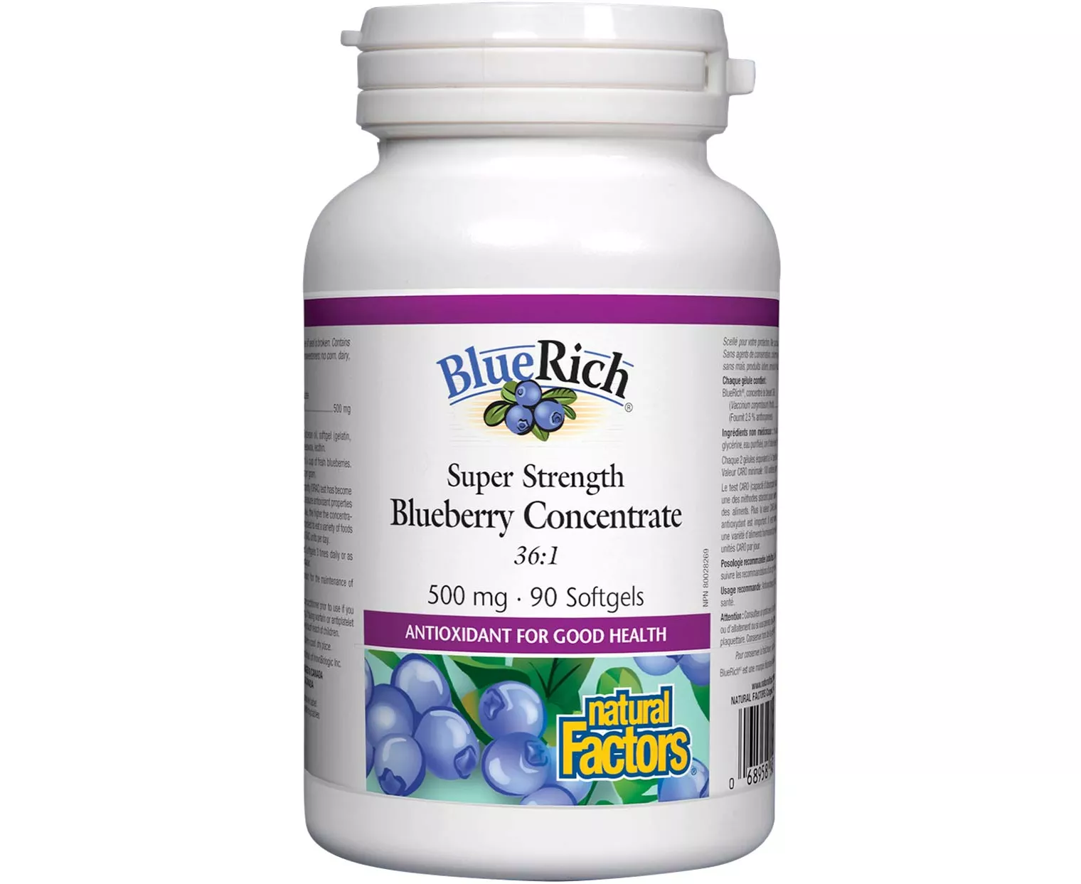 Natural Factors creates BlueRich soft gels from fresh blueberries to provide a superior source of blueberry's unique health-promoting compounds. The soft gels are a potent source of blueberry powder containing a 36:1 extract that provides 36 times the antioxidant power of fresh berries. It is made by Natural Factors from 100% natural blueberry fruit solids without using any solvents preservatives added sugars water flavorings or color. Blueberries are high on the ORAC (Oxygen Radical Absorbance Capacity) scale. Research is showing that high ORAC fruits and vegetables may help protect against common day-to-day oxidative damage.