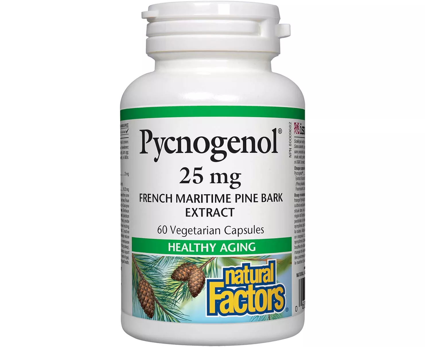 Advanced Info: As we age, inflammation and free radicals cause increasing damage, threatening the health of delicate tissues. Natural Factors Pycnogenol® is a natural plant extract derived from French maritime pine bark (Pinus pinaster) that strengthens cell membranes. Pycnogenol helps restore the integrity of tissues, improving skin elasticity and smoothness while supporting the health of blood vessels, lung tissue, and intestinal membranes. Pycnogenol is one of the most potent scavengers of free radicals. It acts as a natural anti-inflammatory, helps generate collagen and hyaluronic acid to repair membranes, and aids in the production of endothelial nitric oxide, which helps dilate blood vessels. Pycnogenol is increasingly recognized as beneficial for improving symptoms of perimenopause, when the body’s natural antioxidant defences, collagen, and hyaluronic acid production begin to decline. The patented extract is sourced, using no pesticides or herbicides, from the bark of pine trees grown exclusively in southwest France. The concentrated formula is extracted using a chemical-free process that guarantees the potency and purity of Pycnogenol’s active compounds, offering standardized amounts of procyanidins and bioflavonoids. Pycnogenol has been extensively clinically tested and found to be effective. The antioxidant power of Pycnogenol is 20 times greater than vitamin C and 50 times greater than vitamin E.