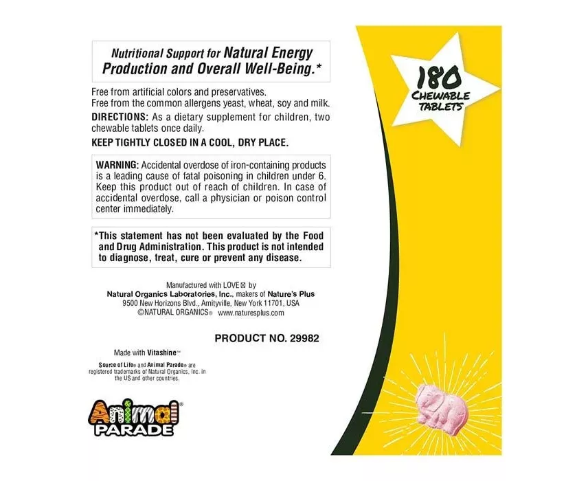 Nutritional Support for Natural Energy Production and Overall Well-Being. Delicious Natural Fruity Flavors! Source of Life Animal Parade children's formula supplies the protection and nutritional assurance all parents seek for their children along with the great taste and animal shapes that kids love. Each chewable tablet supplies 16 vitamins and 8 minerals, as well as nature's most healthful whole foods including spirulina, carrot, broccoli, whole brown rice, and spinach. Combining the natural goodness of whole foods with a balanced profile of nutrients is what makes Animal Parade a complete dietary supplement formulated for your child.