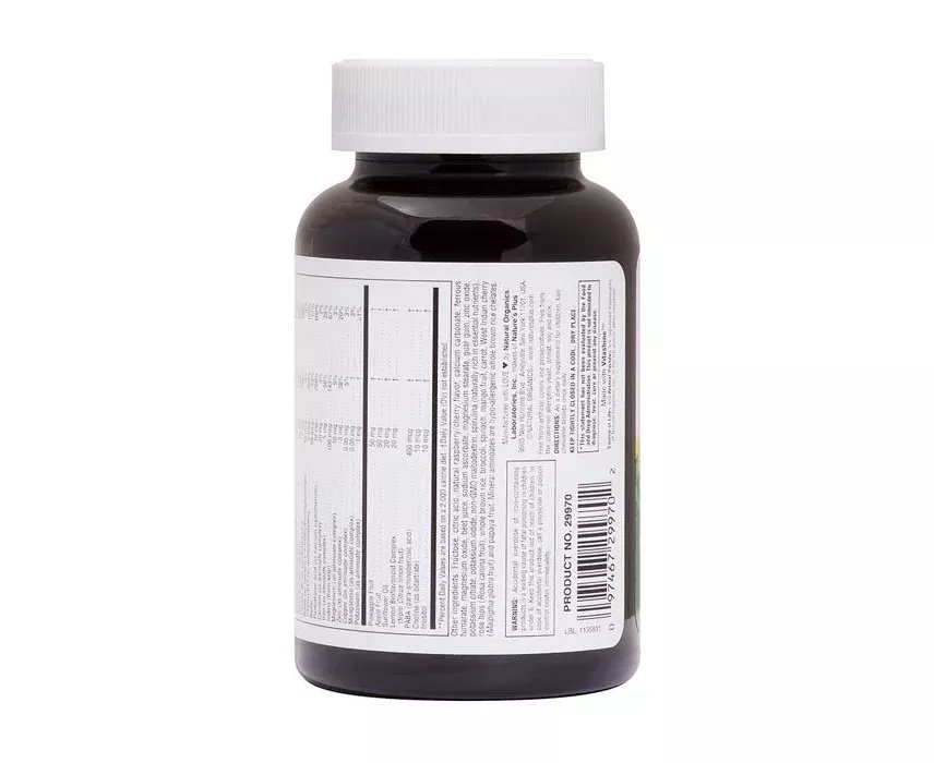 Natural sweeteners (non-GMO cane sugar, fructose), natural flavors, microcrystalline cellulose, vegetable cellulose, citric acid (for flavor), natural color (annatto, grape, beet juice, curcumin), calcium carbonate, magnesium stearate, guar gum, ferrous fumarate, magnesium oxide, spirulina (naturally rich in essential nutrients), zinc oxide, rose hips (rosa canina fruit), potassium citrate, rice bran, papaya fruit, carrot, west indian cherry (malpighia glabra fruit), broccoli, spinach, mango fruit, potassium aminoate, choline bitartrate and stearic acid. Mineral aminoates are whole brown rice chelates.