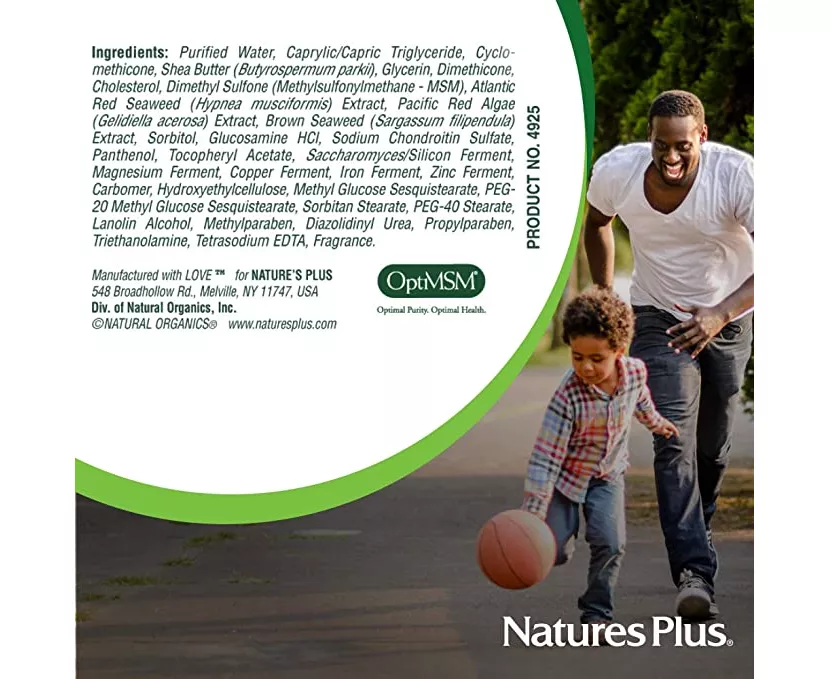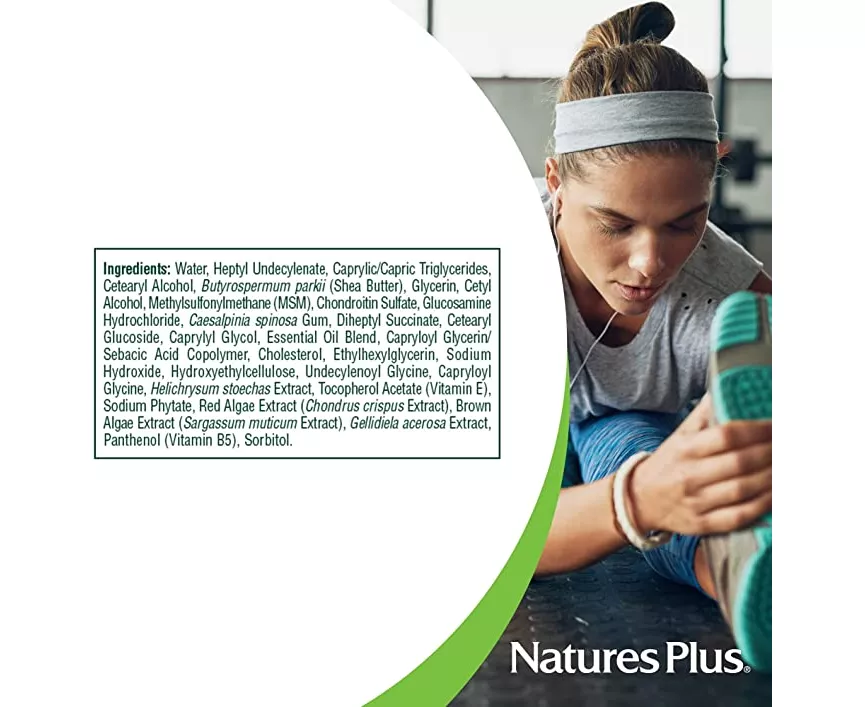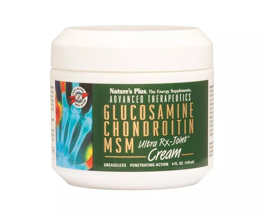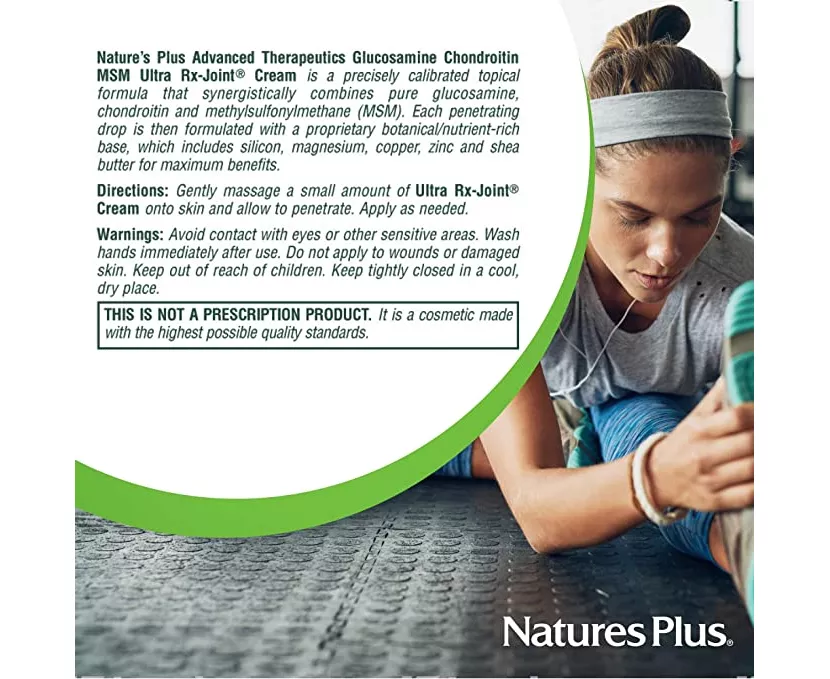 Nature's Plus Advanced Therapeutics Glucosamine Chondroitin MSM Ultra Rx-Joint® Cream is precisely calibrated topical formula that synergistically combines pure glucosamine, chondroitin and methylsulfonylmethane (MSM). Each penetrating drop is then formulated with a proprietary botanical/nutrient-rich base, which includes silicon, magnesium, copper, zinc and shea butter.