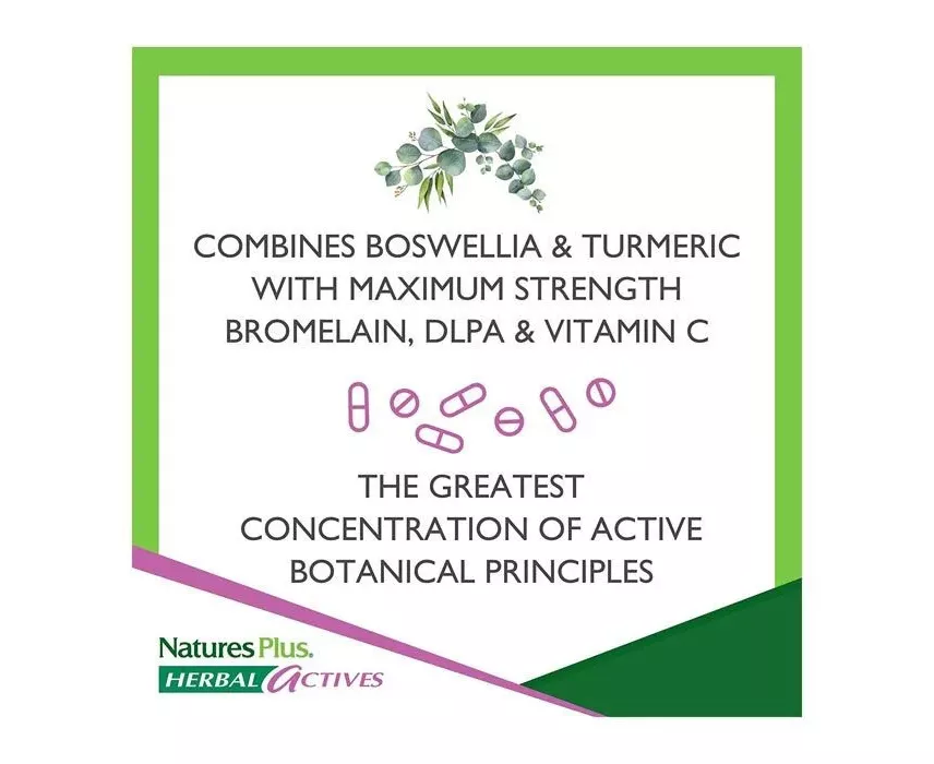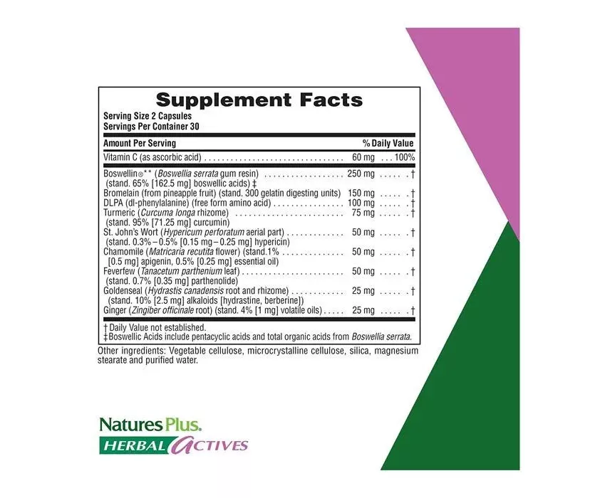 Vitamin C (as ascorbic acid)60 mg100% Boswellin® (Boswellia serrata gum resin)250 mg* Bromelain (from pineapple fruit) (stand. 90 gelatin digesting units)150 mg* DLPA (dl-phenylalanine) (free form amino acid)100 mg* Turmeric (Curcuma longa rhizome) (stand. 95% [71.25 mg] curcumin)75 mg* St. John's Wort (Hypericum perforatum flower) (stand. 0.3-0.5% [0.15-0.25 mg] hypericin)50 mg* Chamomile (Matricaria recutita flower) (stand. 1% [0.5 mg] apigenin, 0.5% [0.25 mg] essential oil)50 mg* Feverfew (Tanacetum parthenium leaf) (stand. 0.7% [0.35 mg] parthenolide)50 mg* Goldenseal (Hydrastis canadensis root and rhizome) (stand. 10% [2.5 mg] alkaloids [hydrastine, berberine])25 mg* Ginger (Zingiber officinale root) (stand. 4% [1 mg] volatile oils)25 mg*