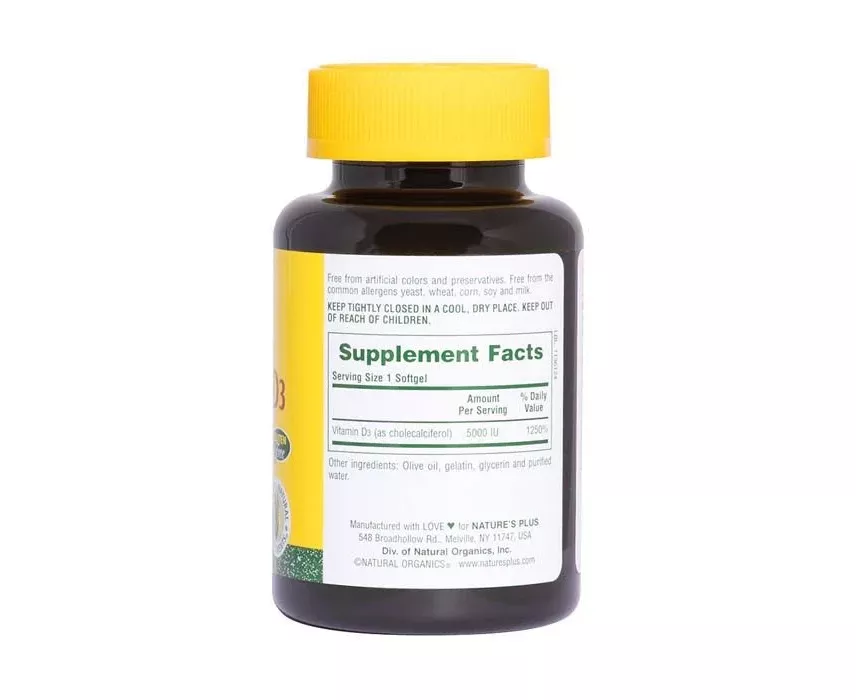 Nutritional support for healthy bones. Nature's Plus Vitamin D3 5000 IU conforms to the strictest standards for purity, including California's Proposition 65. Bioavailable D3 Active Form! Nature's Plus Vitamin D3 5000 IU provides Vitamin D3, nature's most bioavailable form, in one easy-to-swallow softgel. Studies indicate that 5000 IU of vitamin D3 every day can help many people achieve optimal calcium absorption and support healthy bone density. Yet, according to the National Center for Health Statistics, more than 35% of Americans don't even get the minimum Daily Value (DV) of 400 IU, which only serves to prevent deficiency. Nature's Plus Vitamin D3 5000 IU provides the superior health benefits that can only be found at such high-potency levels.