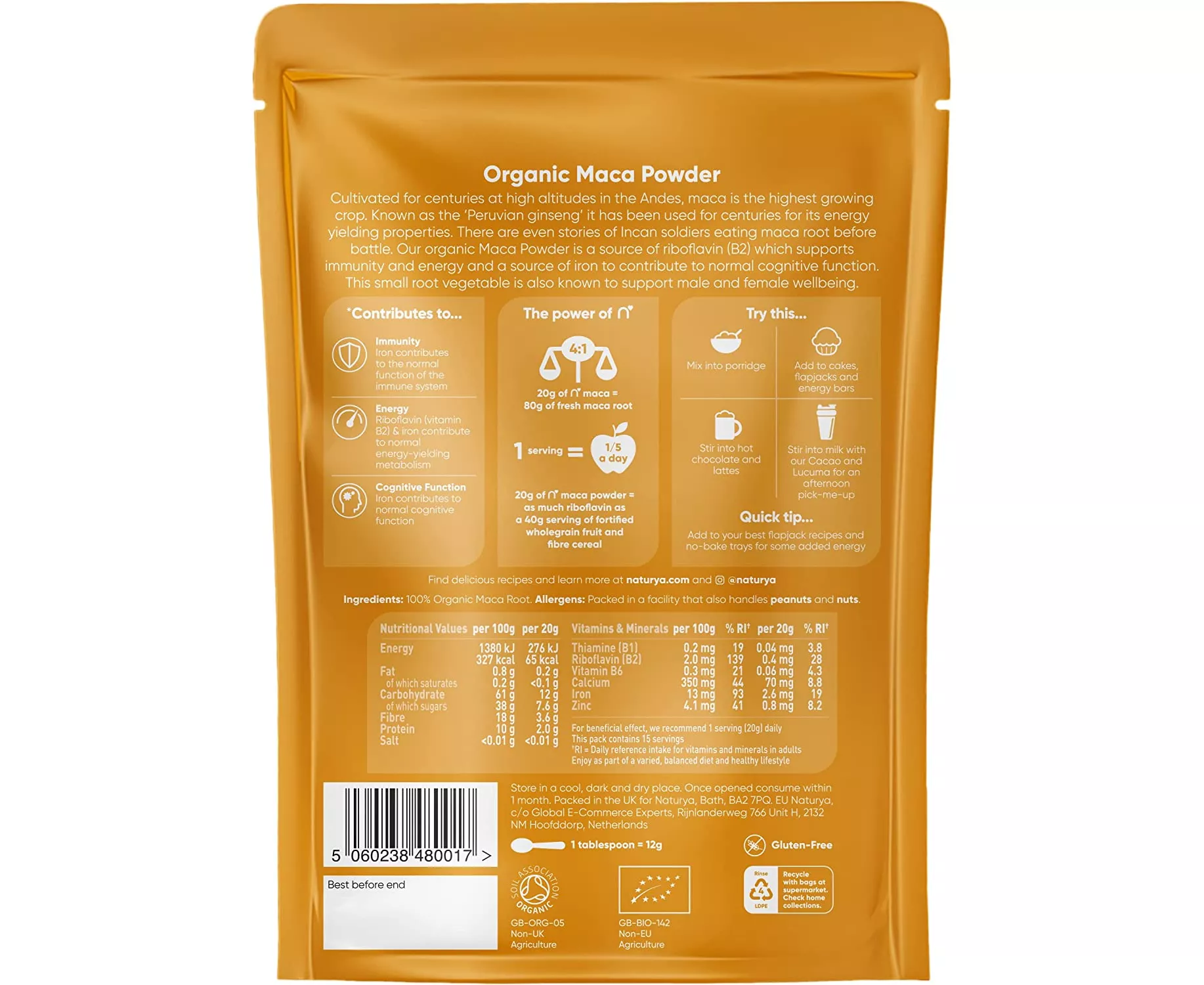 Cultivated for centuries at high altitudes in the Andes, maca is the highest growing crop. Known as the ‘Peruvian ginseng’ it has been used for centuries for its energy yielding properties. There are even stories of Incan soldiers eating maca root before battle. Our Maca Powder is a source of riboflavin (B2) which supports energy and a source of iron which contributes to normal cognitive function and supports immunity. This small root vegetable is also known to support male and female wellbeing.