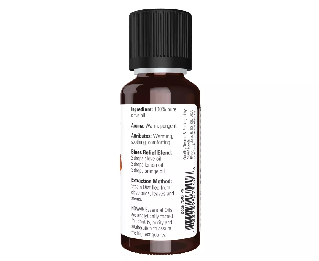 NOW Essential Oils are analytically tested for identity, purity and adulteration to assure the highest quality. Clove Oil has Warm, pungent aroma. Clove oil is Warming, soothing, comforting. Steam Distilled from clove buds, leaves and stems.