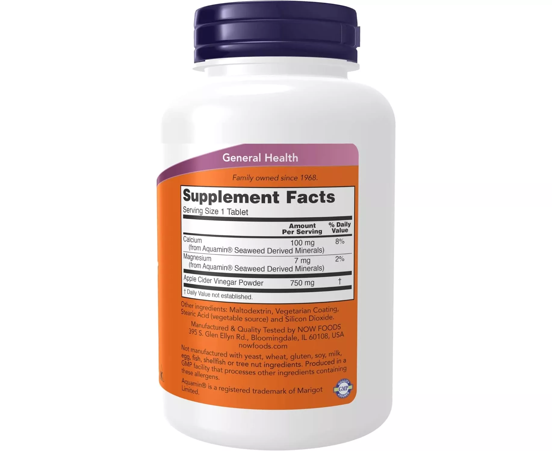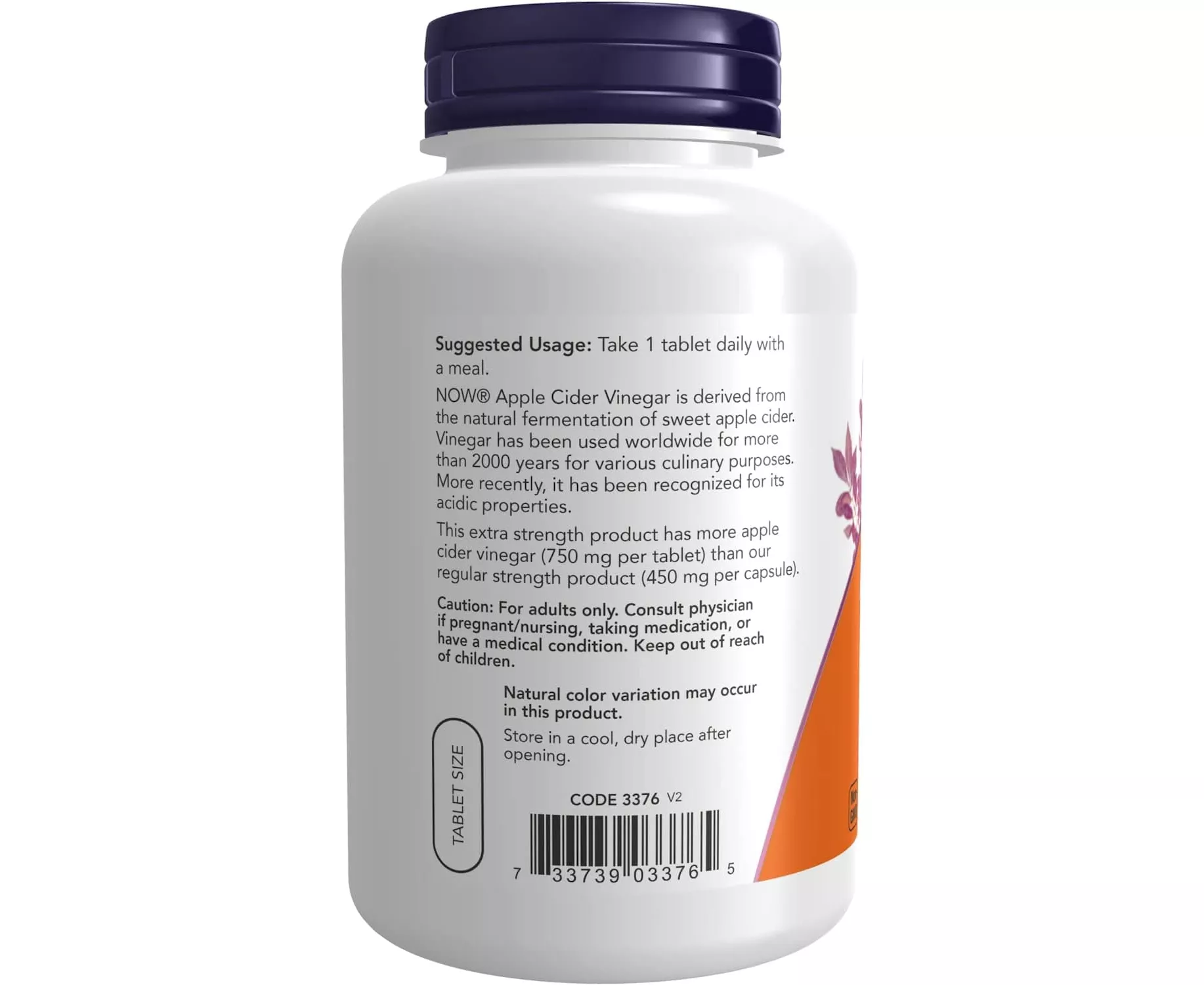 NOW Apple Cider Vinegar is derived from the natural fermentation of sweet apple cider. Vinegar has been used worldwide for more than 2000 years for various culinary purposes. More recently, it has been recognized for its acidic properties. This extra strength product has more apple cider vinegar (750 mg per tablet) than our regular strength product (450 mg per capsule). Natural color variation may occur in this product.