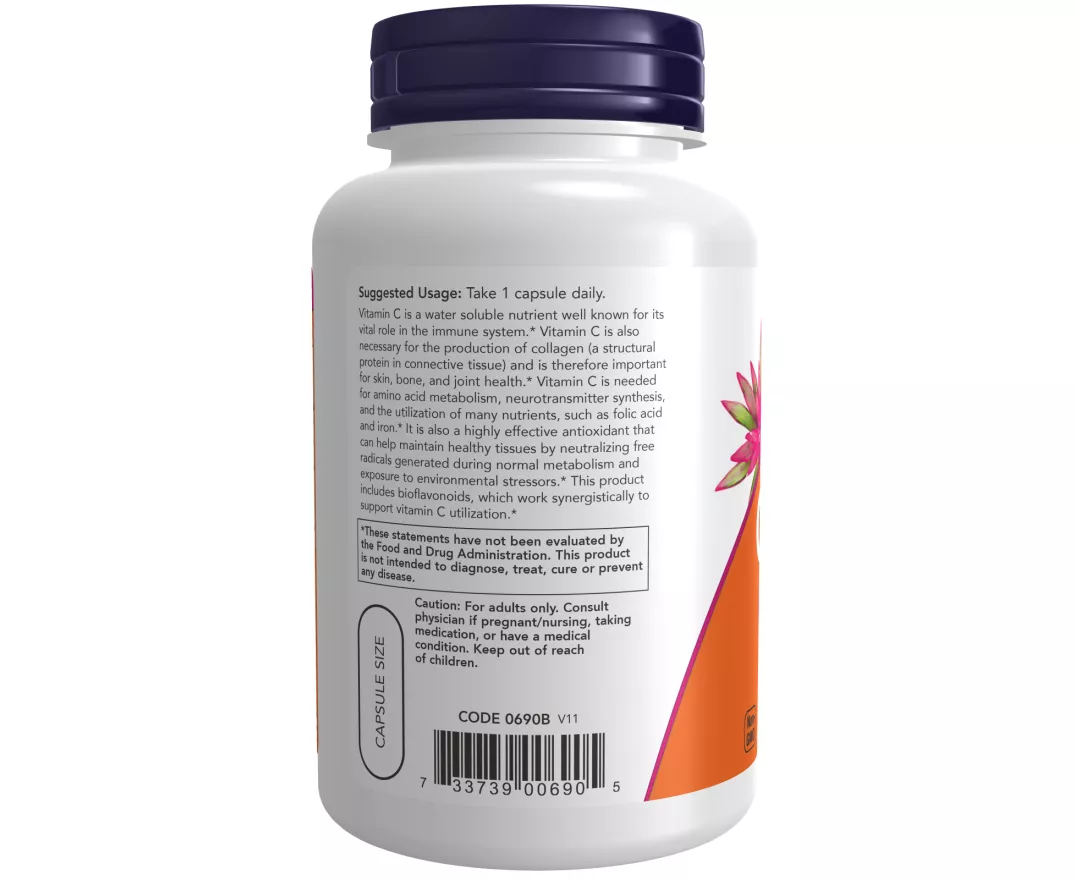 Vitamin C is a water soluble nutrient well known for its vital role in the immune system. Vitamin C is also necessary for the production of collagen (a structural protein in connective tissue) and is therefore important for skin, bone, and joint health. Vitamin C is needed for amino acid metabolism, neurotransmitter synthesis, and the utilization of many nutrients, such as folic acid and iron. It is also a highly effective antioxidant that can help maintain healthy tissues by neutralizing free radicals generated during normal metabolism and exposure to environmental stressors.  This product includes bioflavonoids, which work synergistically to support vitamin C utilization.