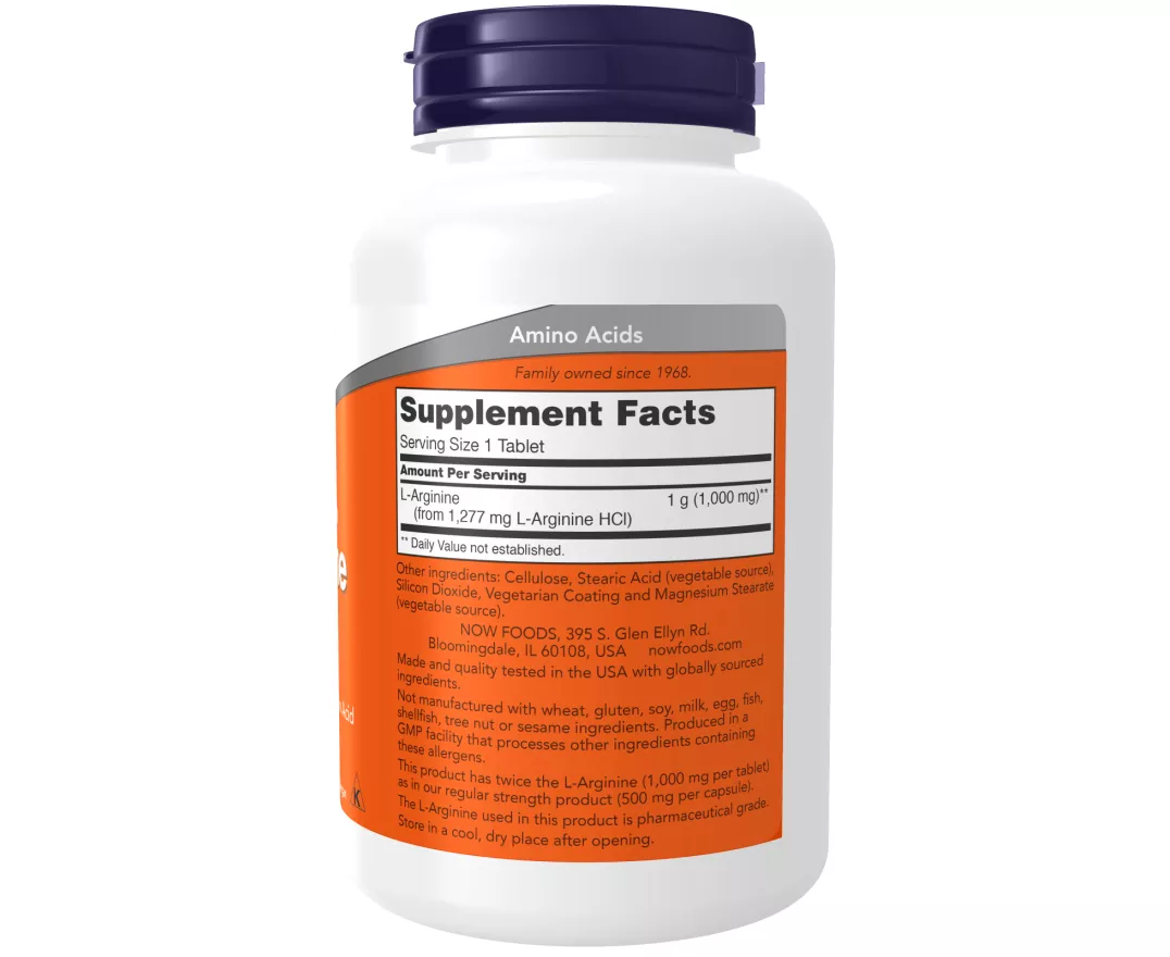 Arginine is a conditionally essential basic amino acid involved primarily in urea metabolism and excretion, as well as in DNA synthesis and protein production. It is an important precursor of nitric oxide (NO) and thus plays a role in the dilation of blood vessels. This product has twice the L-Arginine (1,000 mg per tablet) as in our regular strength product (500 mg per capsule). The L-Arginine used in this product is pharmaceutical grade. Natural color variation may occur in this product.