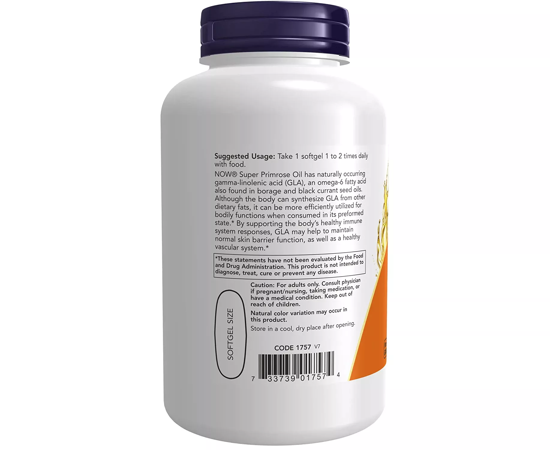 NOW® Super Primrose Oil has naturally occurring gamma linolenic acid (GLA), an Omega-6 fatty acid also found in borage and black currant seed oils. Although the body can synthesize GLA from other dietary fats, it can be more efficiently utilized for bodily functions when consumed in its preformed state.* By supporting the body’s healthy immune system responses, GLA may help to maintain normal skin barrier function, as well as a healthy vascular system.