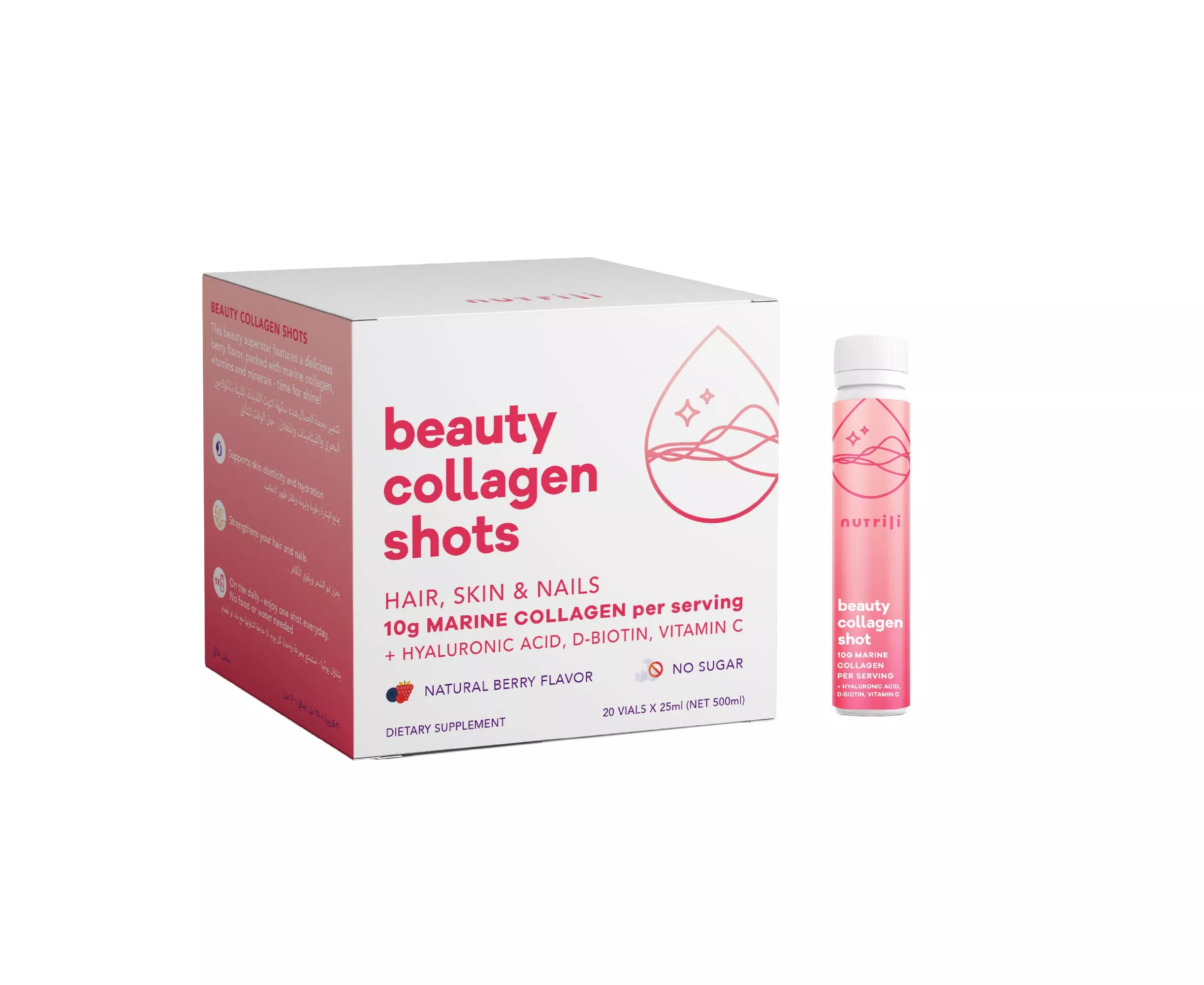 Beauty Collagen Shots is a natural, berry-flavored sugar free drink that promotes a radiant skin complexion, healthy hair and stronger nails. Packed with marine collagen, vitamins, and minerals, it helps strengthen hair roots, promote elasticity and hydration of the skin, increase nail thickness and minimize the appearance of visible signs of aging.