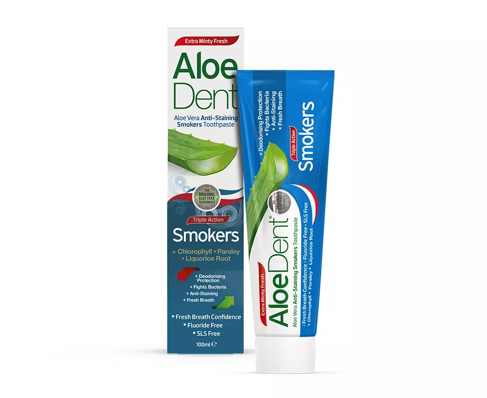 AloeDent Anti-Staining Smokers Toothpaste has been specially formulated for smokers. Thanks to its high quality ingredients, it has an anti-stain action and leaves the breath fresh. Contains Iceland lichen and Licorice root which, together with Aloe Vera Juice, Chlorophyll and Parsley and Mint Extracts, protect and whiten the teeth. It leaves a very fresh mint flavor and has a natural antiseptic action thanks to the tea tree oil contained.