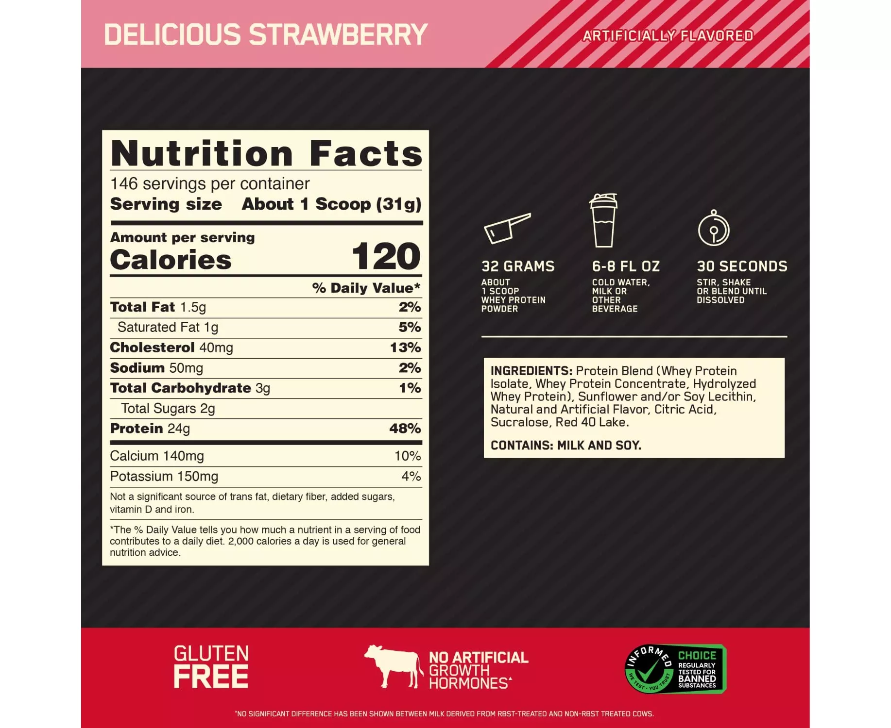 The amino acids in protein are the building blocks of muscle protein synthesis. A whey protein shake consumed before or after exercise helps kick-start this recovery processWhey Protein Isolates (WPI) are the purest form of whey protein that currently exists. WPIs are costly to use, but rate among the best proteins that money can buy. That's why they're the first ingredient you read on the Gold Standard 100% Whey™ label. By using WPI as the primary ingredient along with premium ultra-filtered whey protein concentrate (WPC), we're able to pack 24 grams of protein into every serving to support your muscle building needs after training. ON's attention to detail also extends to mixability. This superior quality powder has been instantized to mix easily using a shaker cup or just a glass and spoon. There's no doubt that this is the standard by which all other whey proteins are measured.