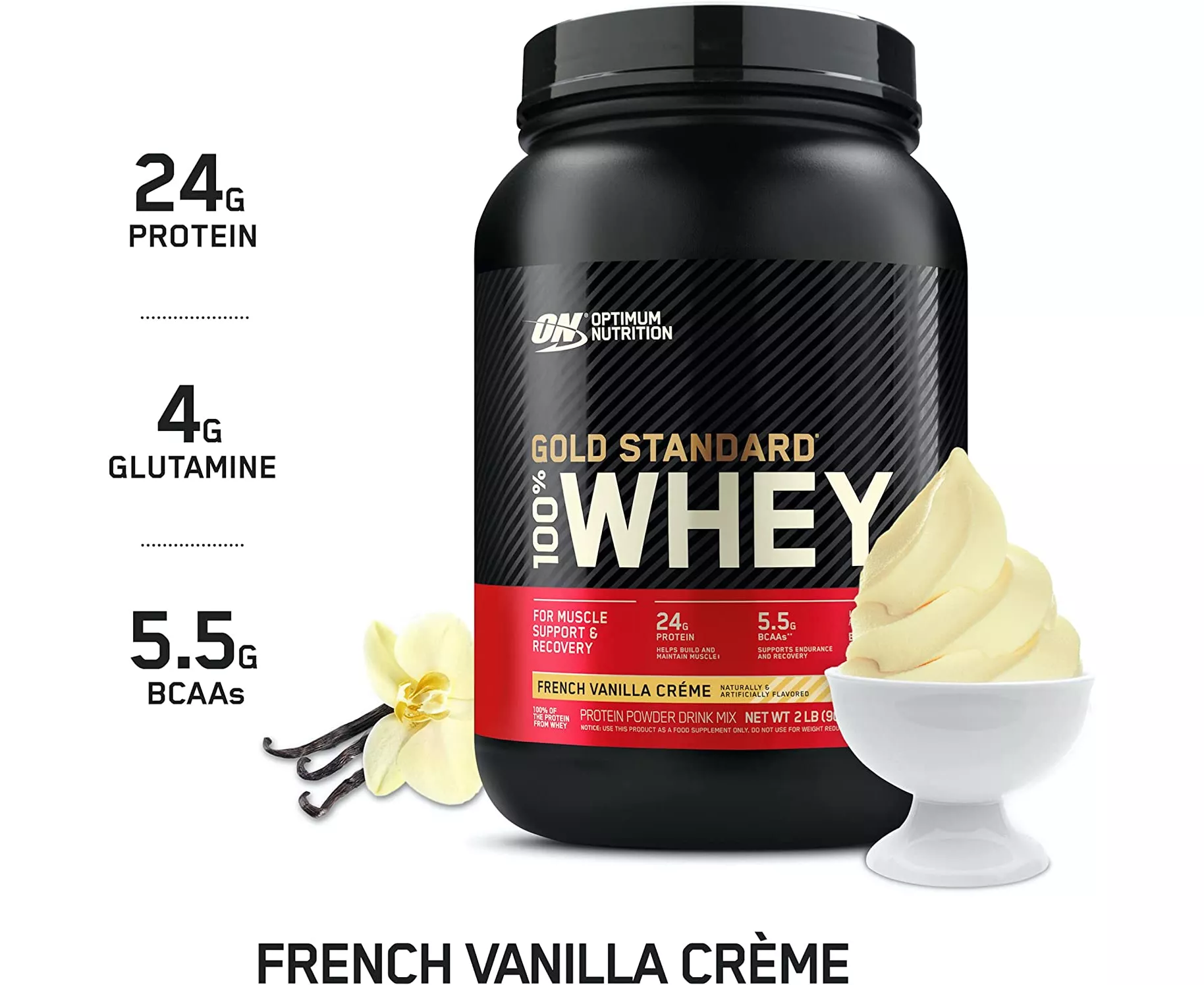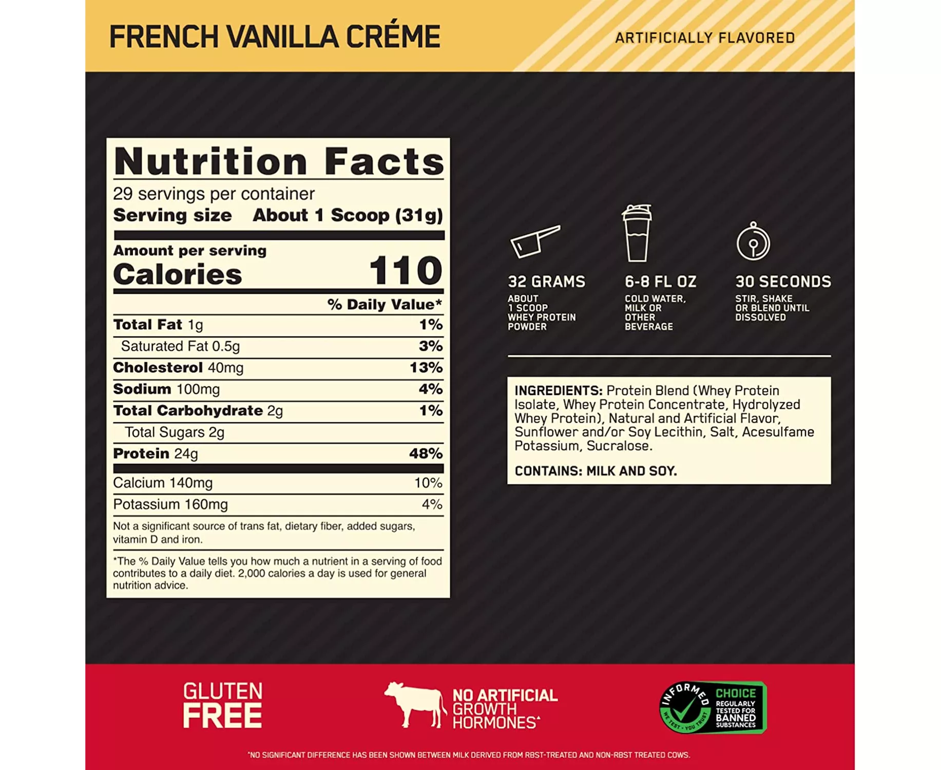 مسحوق بروتين مصل اللبن جولد ستاندرد 100% بنكهة كريمة الفانيليا الفرنسية من أوبتيموم نيوترشن 2 رطل 29 حصة