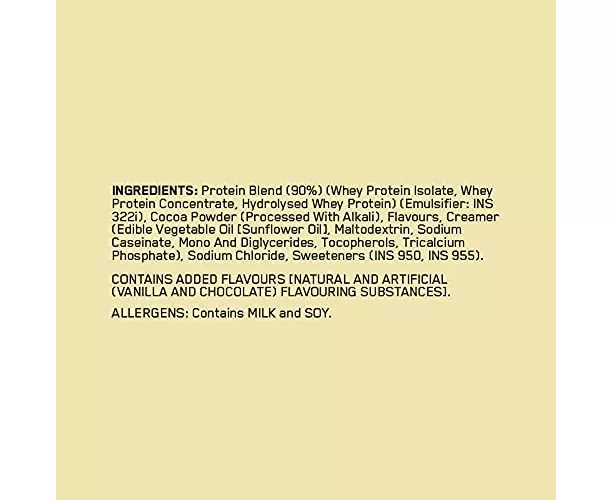 Protein Blend (Whey Protein Isolate, Whey Protein Concentrate, Whey Peptides), Cocoa (Processed with Alkali), Natural and Artificial Flavors, Lecithin, Creamer (Sunflower Oil, Maltodextrin, Modified Food Starch, Dipotassium Phosphate, Tricalcium Phosphate, Tocopherols), Salt, Acesulfame Potassium, Aminogen, Sucralose, Lactase.