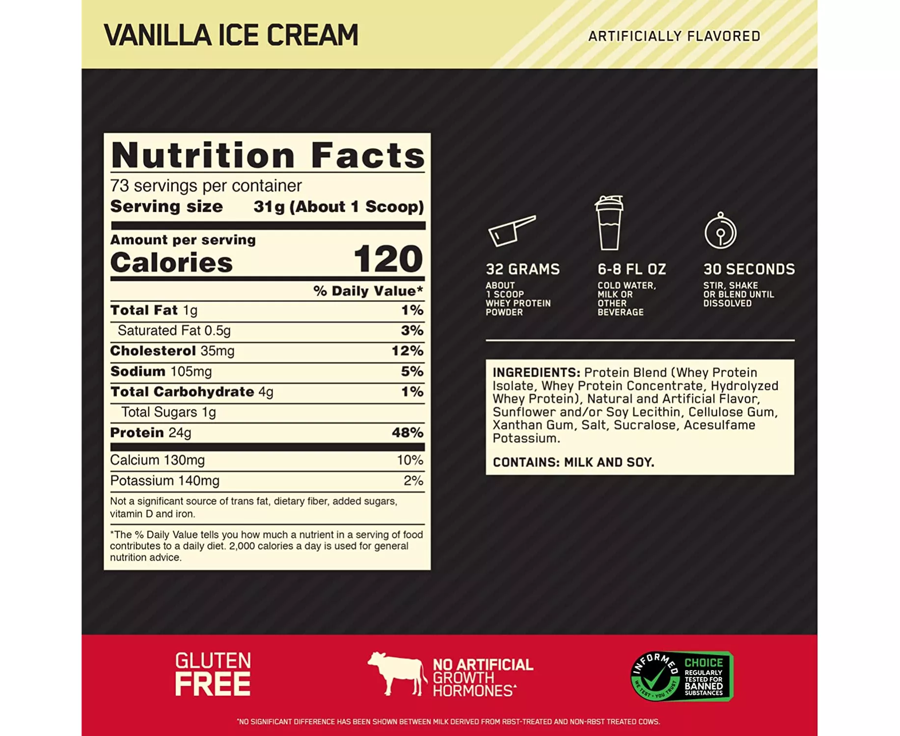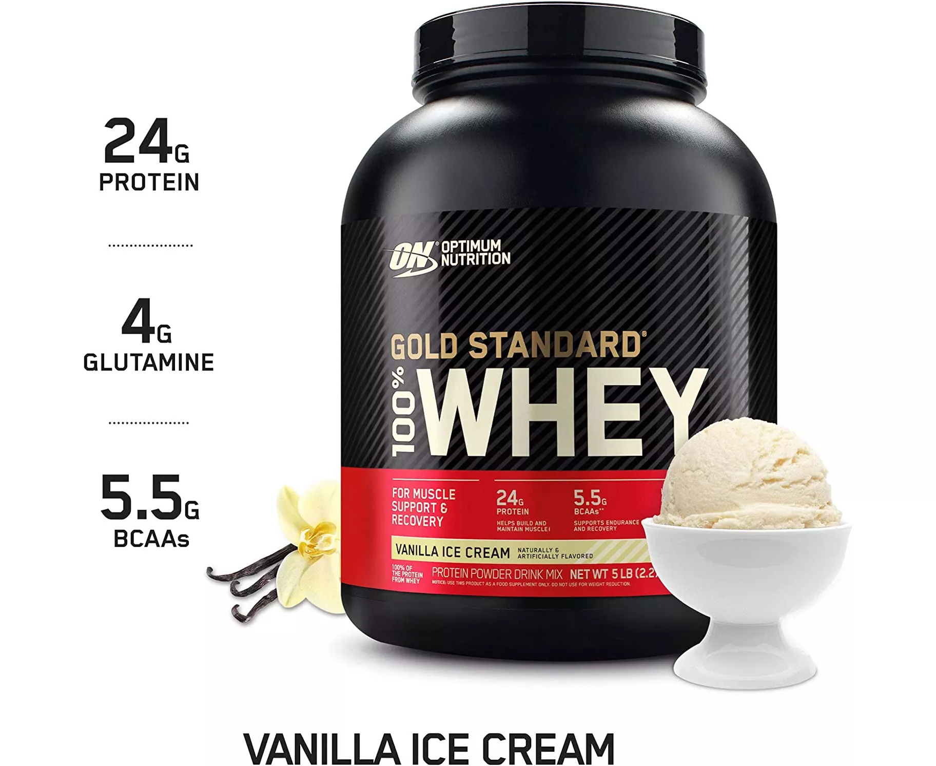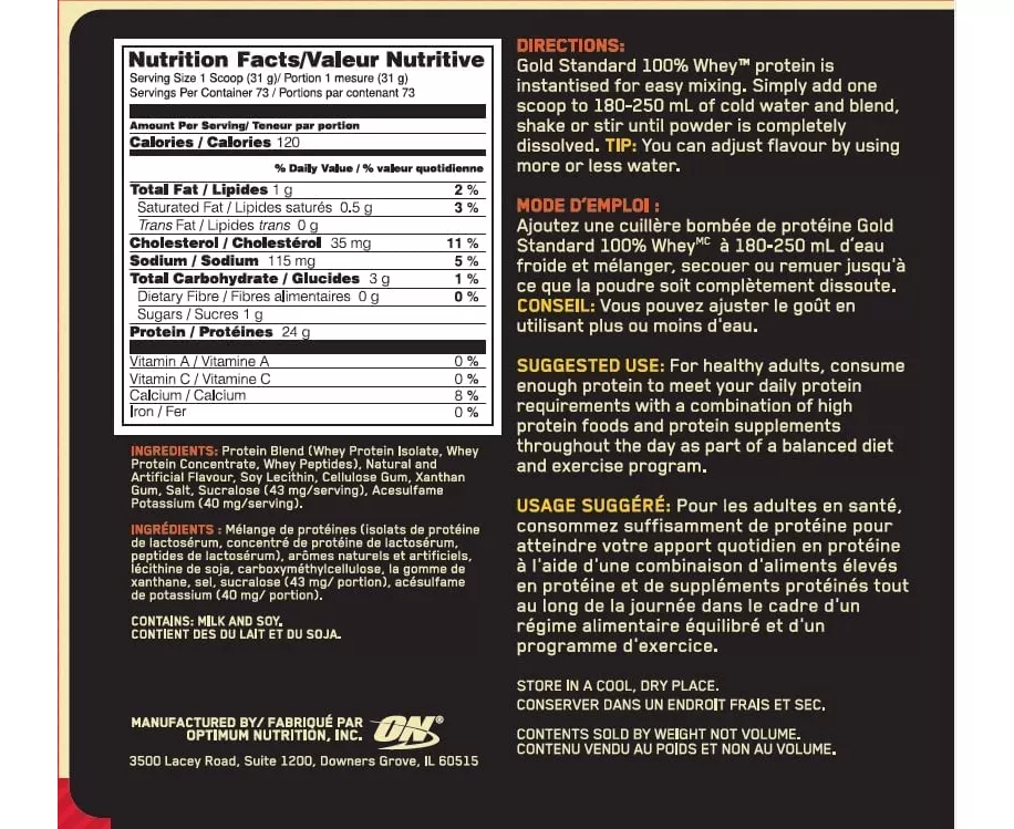Optimum Nutrition's Gold Standard 100% Whey uses pure Whey Protein Isolates as the primary ingredient. Combined with ultra-filtered whey protein concentrate, each serving provides 24 grams of all-whey protein and 5.5 grams of naturally occurring Branched Chain Amino Acids (BCAAs) which are prized by athletes for their muscle building qualities. With more than 20 tempting flavors to choose from, On Gold Standard 100% Whey gives you plenty of ways to keep workout recovery interesting. Search "On Apparel True Strength" to see our new ON clothing line! Mix 1 scoop in 6-8 fluid ounces of cold water, milk, or beverage of choice. For best results, mix up your shake 30-60 minutes after your workout, or have it as an anytime snack in your balanced, high-protein diet.