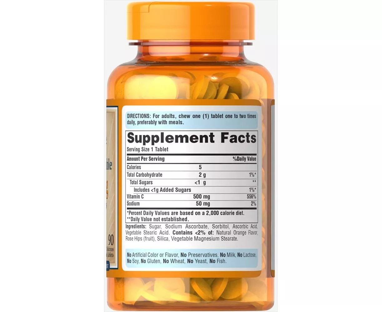 Each delicious orange-flavored tablet contains 500 mg of vitamin C with Rose Hips. This is 833% of the Daily Value for adults and children over 12 years of age.