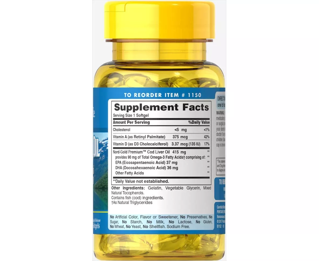 • Nord-Gold Premium™ Cod Liver Oil 415 mg * (provides 90mg of Total Omega-3 Fatty * Acids† comprising of: