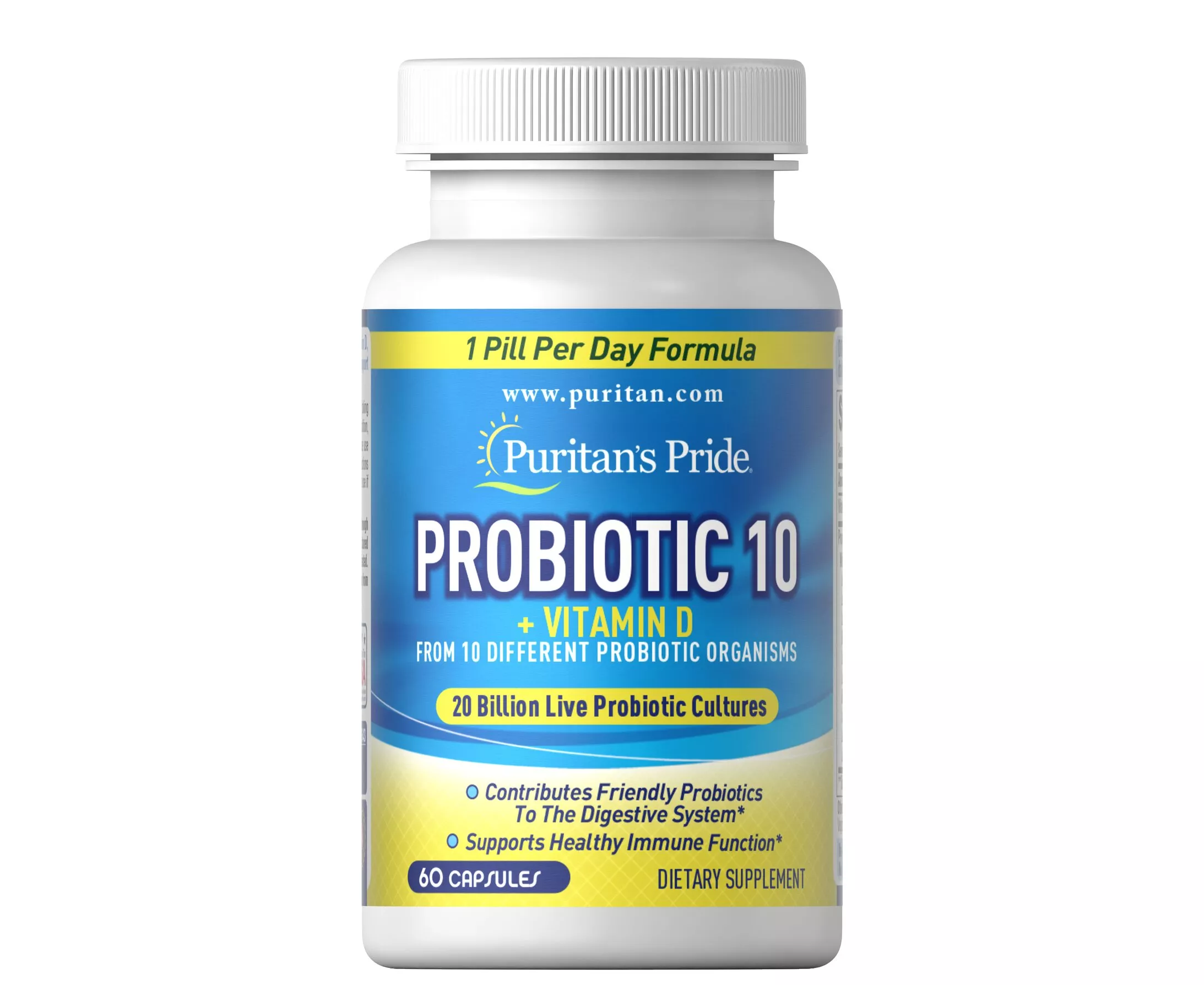 Puritan’s Pride® Probiotic 10 provides 10 unique probiotic strains in just one, easy-to-take capsule per day. Our proprietary probiotic blend delivers 20 billion live culture Colony Forming Units (CFU) per capsule, so you can be sure you are providing your digestive system with the friendly probiotics it needs.* Plus, each serving delivers 25 mcg (1,000 IU) of vitamin D for optimal immune support.* When continuously stored as directed in the original packaging, quality and CFU are guaranteed through expiration. Store in a cool, dry place away from direct sunlight.