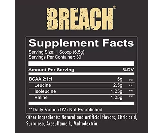 BREACH is the optimal muscle recovery supplement with the researched 2:1:1 BCAA ratio backed by science. Branch Chained Amino Acids, (BCAAs), L-Leucine, L-Isoleucine and L-Valine, are the building blocks for muscle cells; without them, we don’t exist. As we train, work, sleep, and just live our lives, they become depleted. Even if we eat consistently throughout the day there are still gaps that need to be filled to optimize our performance. BCAAs are a staple supplement when it comes to any fitness regimen, because they play a direct and critical role in kick-starting muscle protein synthesis. Utilize Breach as an all-day recovery supplement and take advantage of the benefits of branched chain amino acids.